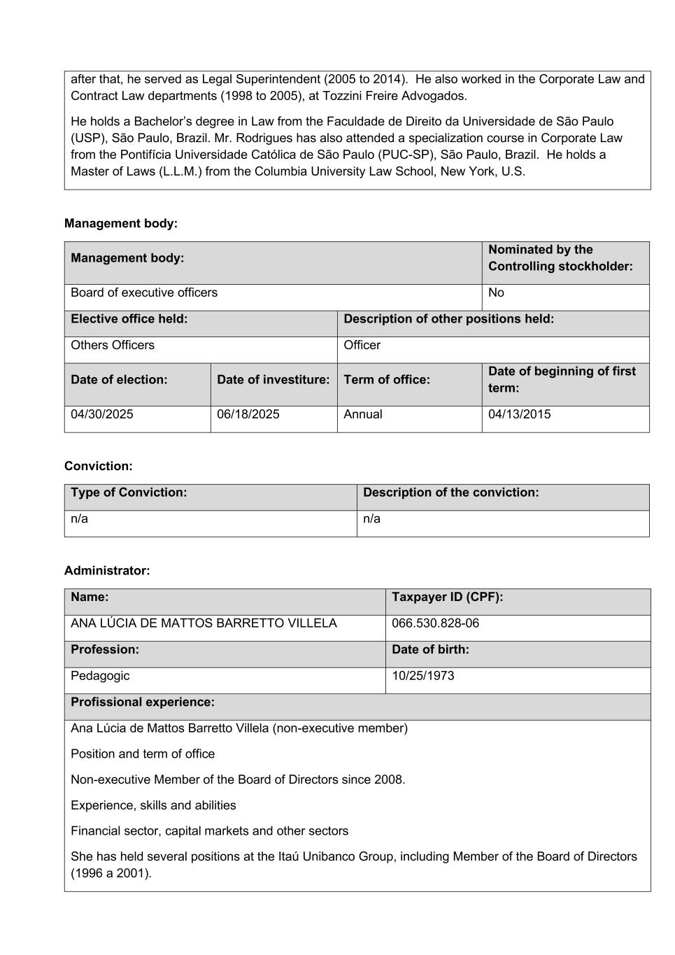 after that, he served as Legal Superintendent (2005 to 2014). He also worked in the Corporate Law and Contract Law departments (1998 to 2005), at Tozzini Freire Advogados. He holds a Bachelor’s degree in Law from the Faculdade de Direito da Universidade de São Paulo (USP), São Paulo, Brazil. Mr. Rodrigues has also attended a specialization course in Corporate Law from the Pontifícia Universidade Católica de São Paulo (PUC-SP), São Paulo, Brazil. He holds a Master of Laws (L.L.M.) from the Columbia University Law School, New York, U.S. Management body: Management body: Nominated by the Controlling stockholder: Board of executive officers No Elective office held: Description of other positions held: Others Officers Officer Date of election: Date of investiture: Term of office: Date of beginning of first term: 04/30/2025 06/18/2025 Annual 04/13/2015 Conviction: Type of Conviction: Description of the conviction: n/a n/a Administrator: Name: Taxpayer ID (CPF): ANA LÚCIA DE MATTOS BARRETTO VILLELA 066.530.828-06 Profession: Date of birth: Pedagogic 10/25/1973 Profissional experience: Ana Lúcia de Mattos Barretto Villela (non-executive member) Position and term of office Non-executive Member of the Board of Directors since 2008. Experience, skills and abilities Financial sector, capital markets and other sectors She has held several positions at the Itaú Unibanco Group, including Member of the Board of Directors (1996 a 2001).