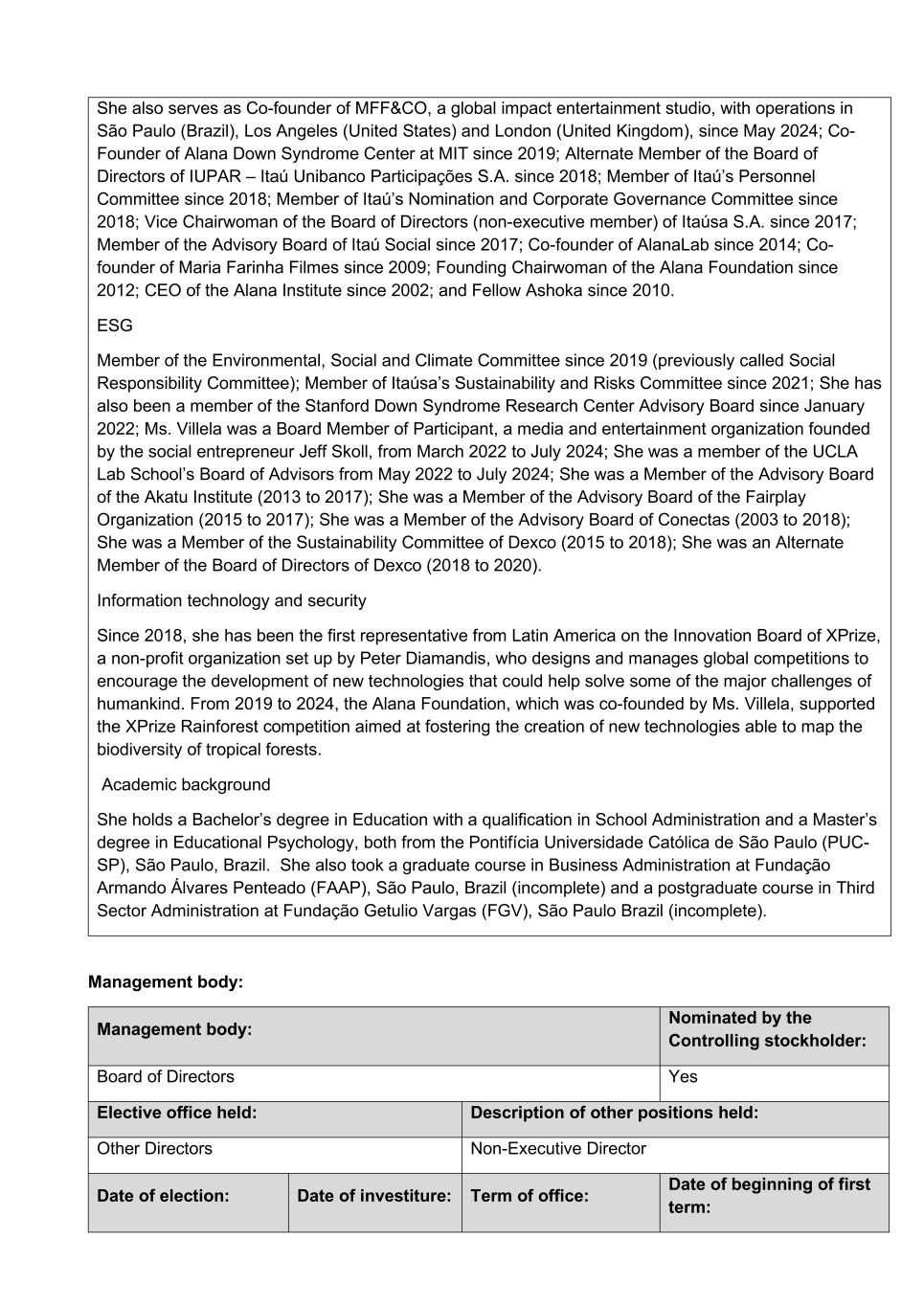 She also serves as Co-founder of MFF&CO, a global impact entertainment studio, with operations in São Paulo (Brazil), Los Angeles (United States) and London (United Kingdom), since May 2024; Co- Founder of Alana Down Syndrome Center at MIT since 2019; Alternate Member of the Board of Directors of IUPAR – Itaú Unibanco Participações S.A. since 2018; Member of Itaú’s Personnel Committee since 2018; Member of Itaú’s Nomination and Corporate Governance Committee since 2018; Vice Chairwoman of the Board of Directors (non-executive member) of Itaúsa S.A. since 2017; Member of the Advisory Board of Itaú Social since 2017; Co-founder of AlanaLab since 2014; Co- founder of Maria Farinha Filmes since 2009; Founding Chairwoman of the Alana Foundation since 2012; CEO of the Alana Institute since 2002; and Fellow Ashoka since 2010. ESG Member of the Environmental, Social and Climate Committee since 2019 (previously called Social Responsibility Committee); Member of Itaúsa’s Sustainability and Risks Committee since 2021; She has also been a member of the Stanford Down Syndrome Research Center Advisory Board since January 2022; Ms. Villela was a Board Member of Participant, a media and entertainment organization founded by the social entrepreneur Jeff Skoll, from March 2022 to July 2024; She was a member of the UCLA Lab School’s Board of Advisors from May 2022 to July 2024; She was a Member of the Advisory Board of the Akatu Institute (2013 to 2017); She was a Member of the Advisory Board of the Fairplay Organization (2015 to 2017); She was a Member of the Advisory Board of Conectas (2003 to 2018); She was a Member of the Sustainability Committee of Dexco (2015 to 2018); She was an Alternate Member of the Board of Directors of Dexco (2018 to 2020). Information technology and security Since 2018, she has been the first representative from Latin America on the Innovation Board of XPrize, a non-profit organization set up by Peter Diamandis, who designs and manages global competitions to encourage the development of new technologies that could help solve some of the major challenges of humankind. From 2019 to 2024, the Alana Foundation, which was co-founded by Ms. Villela, supported the XPrize Rainforest competition aimed at fostering the creation of new technologies able to map the biodiversity of tropical forests. Academic background She holds a Bachelor’s degree in Education with a qualification in School Administration and a Master’s degree in Educational Psychology, both from the Pontifícia Universidade Católica de São Paulo (PUC- SP), São Paulo, Brazil. She also took a graduate course in Business Administration at Fundação Armando Álvares Penteado (FAAP), São Paulo, Brazil (incomplete) and a postgraduate course in Third Sector Administration at Fundação Getulio Vargas (FGV), São Paulo Brazil (incomplete). Management body: Management body: Nominated by the Controlling stockholder: Board of Directors Yes Elective office held: Description of other positions held: Other Directors Non-Executive Director Date of election: Date of investiture: Term of office: Date of beginning of first term: