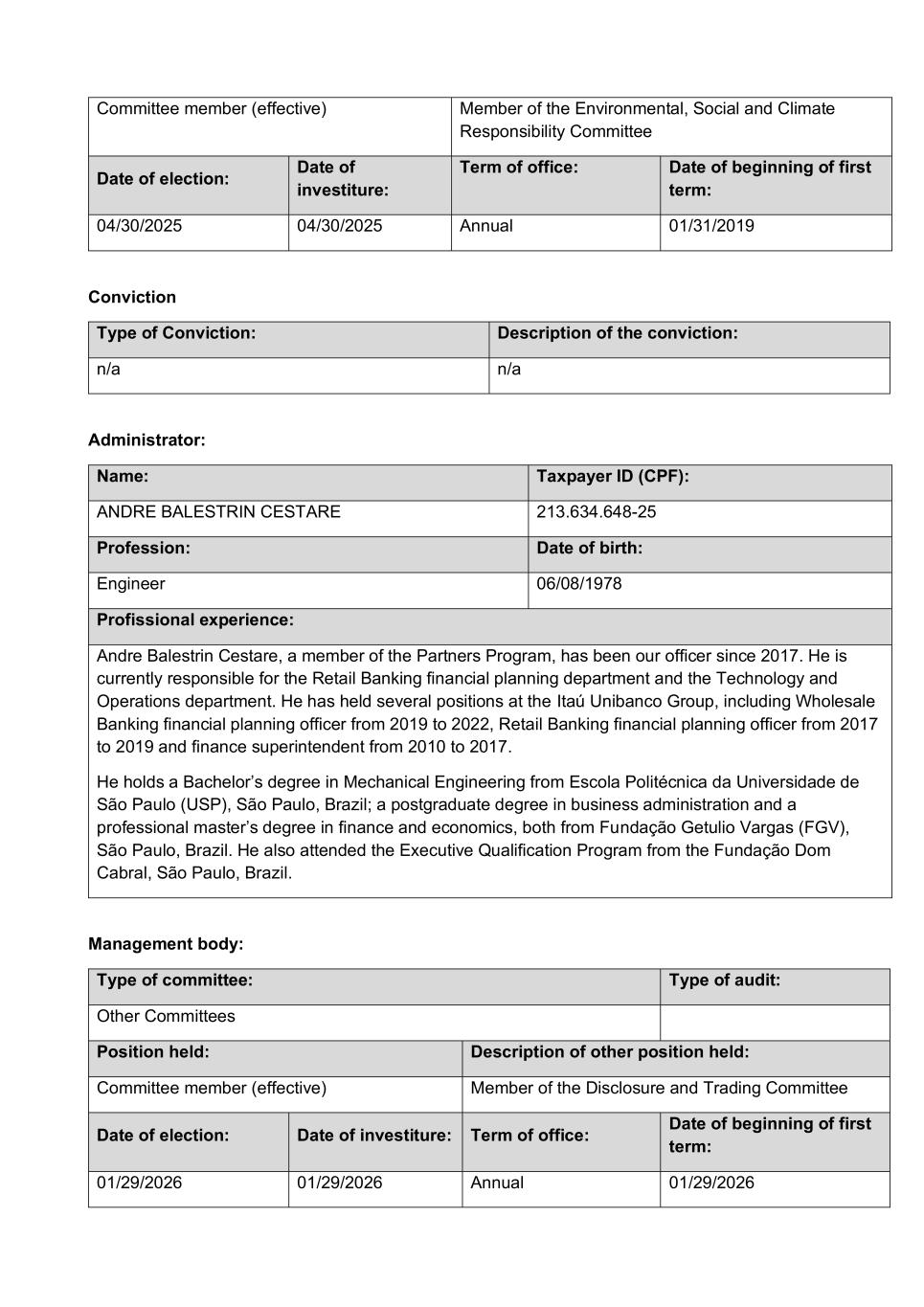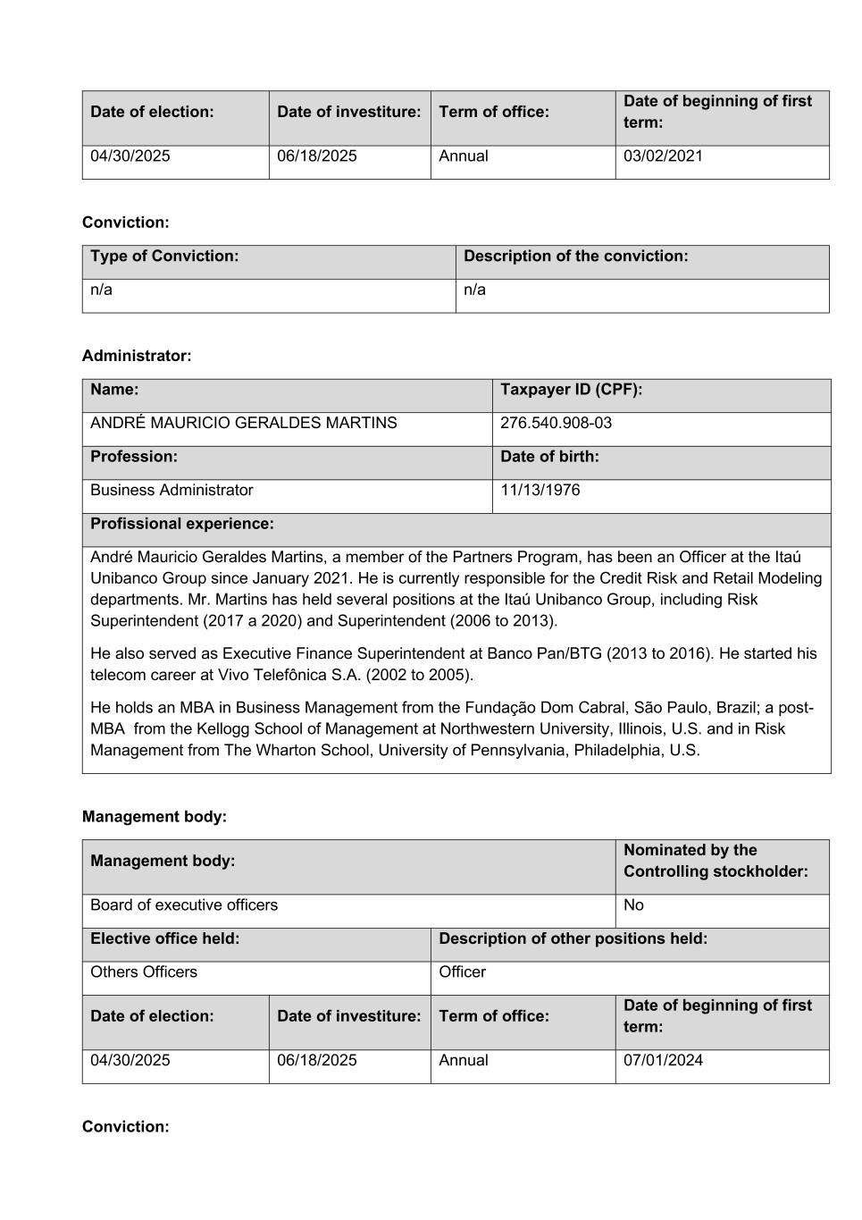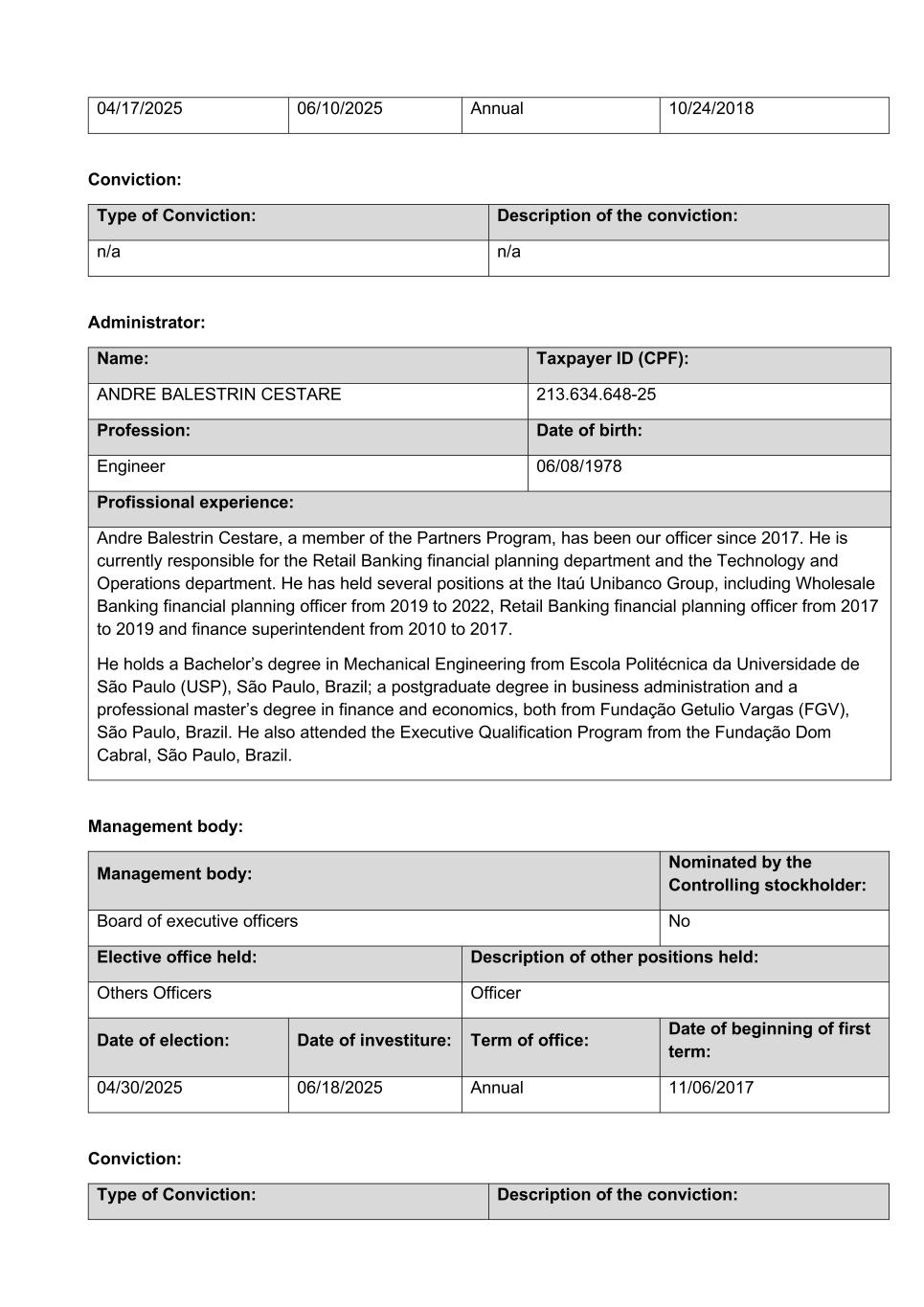 04/17/2025 06/10/2025 Annual 10/24/2018 Conviction: Type of Conviction: Description of the conviction: n/a n/a Administrator: Name: Taxpayer ID (CPF): ANDRE BALESTRIN CESTARE 213.634.648-25 Profession: Date of birth: Engineer 06/08/1978 Profissional experience: Andre Balestrin Cestare, a member of the Partners Program, has been our officer since 2017. He is currently responsible for the Retail Banking financial planning department and the Technology and Operations department. He has held several positions at the Itaú Unibanco Group, including Wholesale Banking financial planning officer from 2019 to 2022, Retail Banking financial planning officer from 2017 to 2019 and finance superintendent from 2010 to 2017. He holds a Bachelor’s degree in Mechanical Engineering from Escola Politécnica da Universidade de São Paulo (USP), São Paulo, Brazil; a postgraduate degree in business administration and a professional master’s degree in finance and economics, both from Fundação Getulio Vargas (FGV), São Paulo, Brazil. He also attended the Executive Qualification Program from the Fundação Dom Cabral, São Paulo, Brazil. Management body: Management body: Nominated by the Controlling stockholder: Board of executive officers No Elective office held: Description of other positions held: Others Officers Officer Date of election: Date of investiture: Term of office: Date of beginning of first term: 04/30/2025 06/18/2025 Annual 11/06/2017 Conviction: Type of Conviction: Description of the conviction: