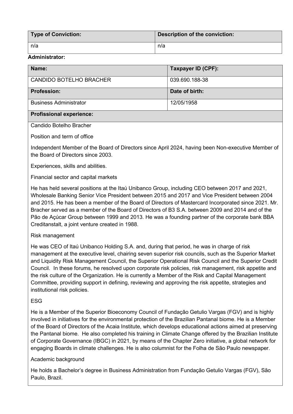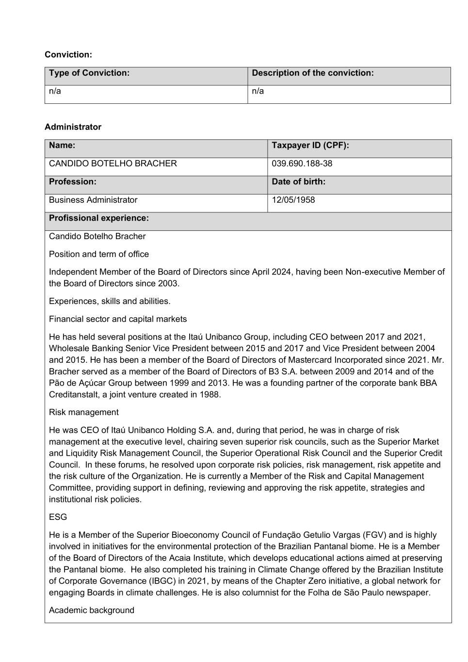 Conviction: Type of Conviction: Description of the conviction: n/a n/a Administrator Name: Taxpayer ID (CPF): CANDIDO BOTELHO BRACHER 039.690.188-38 Profession: Date of birth: Business Administrator 12/05/1958 Profissional experience: Candido Botelho Bracher Position and term of office Independent Member of the Board of Directors since April 2024, having been Non-executive Member of the Board of Directors since 2003. Experiences, skills and abilities. Financial sector and capital markets He has held several positions at the Itaú Unibanco Group, including CEO between 2017 and 2021, Wholesale Banking Senior Vice President between 2015 and 2017 and Vice President between 2004 and 2015. He has been a member of the Board of Directors of Mastercard Incorporated since 2021. Mr. Bracher served as a member of the Board of Directors of B3 S.A. between 2009 and 2014 and of the Pão de Açúcar Group between 1999 and 2013. He was a founding partner of the corporate bank BBA Creditanstalt, a joint venture created in 1988. Risk management He was CEO of Itaú Unibanco Holding S.A. and, during that period, he was in charge of risk management at the executive level, chairing seven superior risk councils, such as the Superior Market and Liquidity Risk Management Council, the Superior Operational Risk Council and the Superior Credit Council. In these forums, he resolved upon corporate risk policies, risk management, risk appetite and the risk culture of the Organization. He is currently a Member of the Risk and Capital Management Committee, providing support in defining, reviewing and approving the risk appetite, strategies and institutional risk policies. ESG He is a Member of the Superior Bioeconomy Council of Fundação Getulio Vargas (FGV) and is highly involved in initiatives for the environmental protection of the Brazilian Pantanal biome. He is a Member of the Board of Directors of the Acaia Institute, which develops educational actions aimed at preserving the Pantanal biome. He also completed his training in Climate Change offered by the Brazilian Institute of Corporate Governance (IBGC) in 2021, by means of the Chapter Zero initiative, a global network for engaging Boards in climate challenges. He is also columnist for the Folha de São Paulo newspaper. Academic background