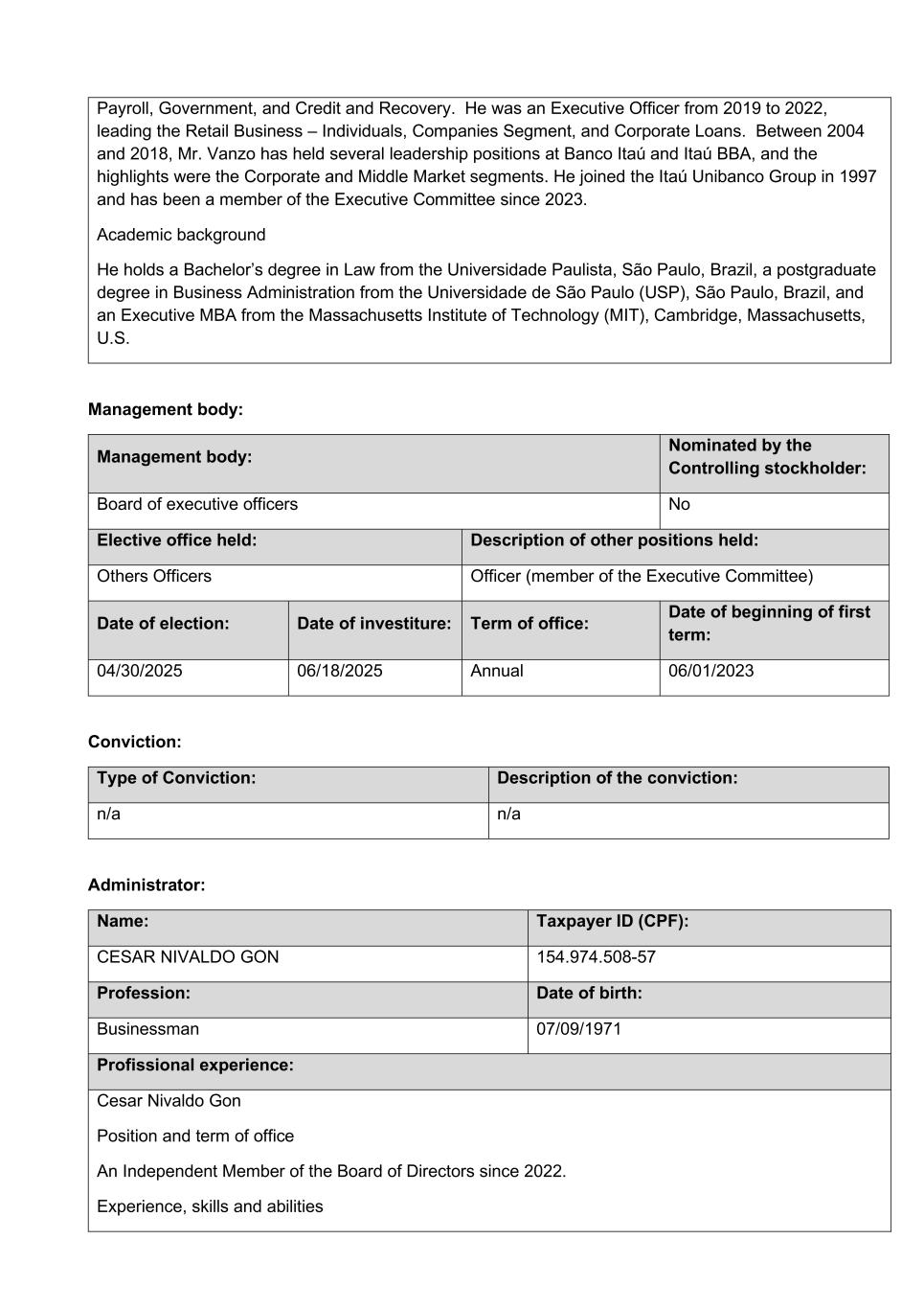 Payroll, Government, and Credit and Recovery. He was an Executive Officer from 2019 to 2022, leading the Retail Business – Individuals, Companies Segment, and Corporate Loans. Between 2004 and 2018, Mr. Vanzo has held several leadership positions at Banco Itaú and Itaú BBA, and the highlights were the Corporate and Middle Market segments. He joined the Itaú Unibanco Group in 1997 and has been a member of the Executive Committee since 2023. Academic background He holds a Bachelor’s degree in Law from the Universidade Paulista, São Paulo, Brazil, a postgraduate degree in Business Administration from the Universidade de São Paulo (USP), São Paulo, Brazil, and an Executive MBA from the Massachusetts Institute of Technology (MIT), Cambridge, Massachusetts, U.S. Management body: Management body: Nominated by the Controlling stockholder: Board of executive officers No Elective office held: Description of other positions held: Others Officers Officer (member of the Executive Committee) Date of election: Date of investiture: Term of office: Date of beginning of first term: 04/30/2025 06/18/2025 Annual 06/01/2023 Conviction: Type of Conviction: Description of the conviction: n/a n/a Administrator: Name: Taxpayer ID (CPF): CESAR NIVALDO GON 154.974.508-57 Profession: Date of birth: Businessman 07/09/1971 Profissional experience: Cesar Nivaldo Gon Position and term of office An Independent Member of the Board of Directors since 2022. Experience, skills and abilities
