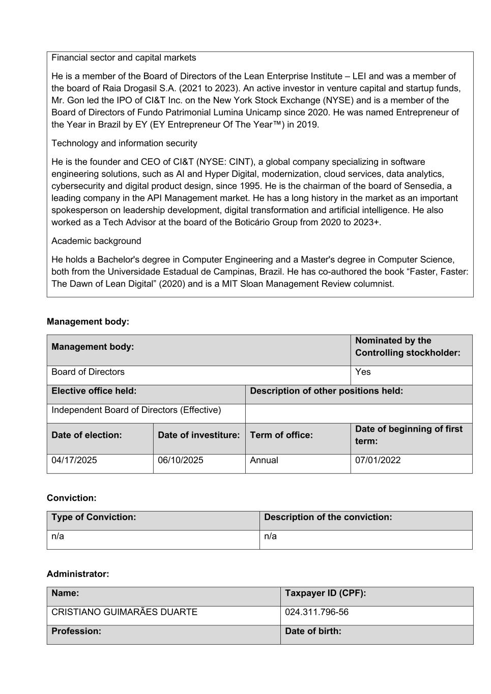 Financial sector and capital markets He is a member of the Board of Directors of the Lean Enterprise Institute – LEI and was a member of the board of Raia Drogasil S.A. (2021 to 2023). An active investor in venture capital and startup funds, Mr. Gon led the IPO of CI&T Inc. on the New York Stock Exchange (NYSE) and is a member of the Board of Directors of Fundo Patrimonial Lumina Unicamp since 2020. He was named Entrepreneur of the Year in Brazil by EY (EY Entrepreneur Of The Year™) in 2019. Technology and information security He is the founder and CEO of CI&T (NYSE: CINT), a global company specializing in software engineering solutions, such as AI and Hyper Digital, modernization, cloud services, data analytics, cybersecurity and digital product design, since 1995. He is the chairman of the board of Sensedia, a leading company in the API Management market. He has a long history in the market as an important spokesperson on leadership development, digital transformation and artificial intelligence. He also worked as a Tech Advisor at the board of the Boticário Group from 2020 to 2023+. Academic background He holds a Bachelor's degree in Computer Engineering and a Master's degree in Computer Science, both from the Universidade Estadual de Campinas, Brazil. He has co-authored the book “Faster, Faster: The Dawn of Lean Digital” (2020) and is a MIT Sloan Management Review columnist. Management body: Management body: Nominated by the Controlling stockholder: Board of Directors Yes Elective office held: Description of other positions held: Independent Board of Directors (Effective) Date of election: Date of investiture: Term of office: Date of beginning of first term: 04/17/2025 06/10/2025 Annual 07/01/2022 Conviction: Type of Conviction: Description of the conviction: n/a n/a Administrator: Name: Taxpayer ID (CPF): CRISTIANO GUIMARÃES DUARTE 024.311.796-56 Profession: Date of birth: