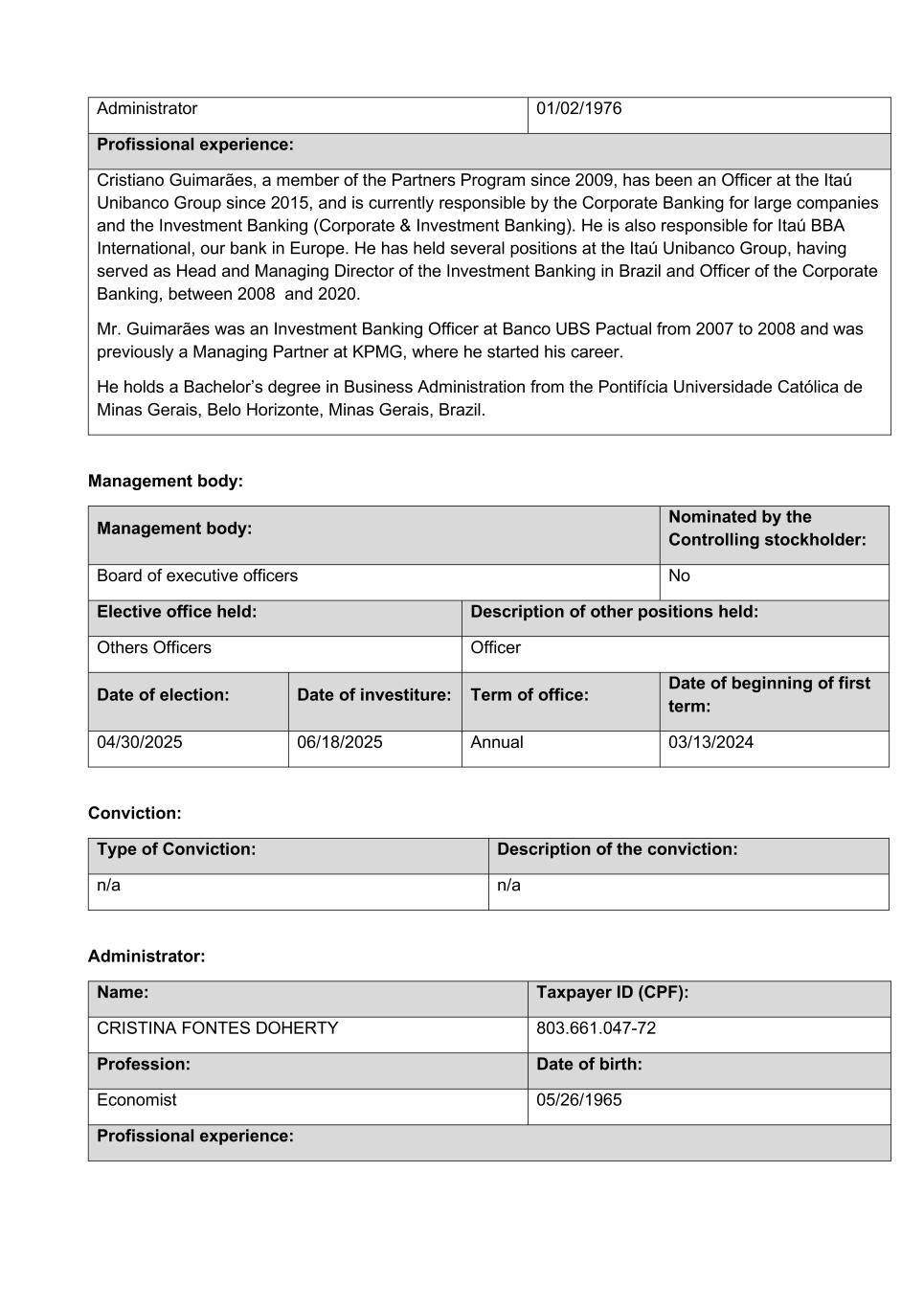Administrator 01/02/1976 Profissional experience: Cristiano Guimarães, a member of the Partners Program since 2009, has been an Officer at the Itaú Unibanco Group since 2015, and is currently responsible by the Corporate Banking for large companies and the Investment Banking (Corporate & Investment Banking). He is also responsible for Itaú BBA International, our bank in Europe. He has held several positions at the Itaú Unibanco Group, having served as Head and Managing Director of the Investment Banking in Brazil and Officer of the Corporate Banking, between 2008 and 2020. Mr. Guimarães was an Investment Banking Officer at Banco UBS Pactual from 2007 to 2008 and was previously a Managing Partner at KPMG, where he started his career. He holds a Bachelor’s degree in Business Administration from the Pontifícia Universidade Católica de Minas Gerais, Belo Horizonte, Minas Gerais, Brazil. Management body: Management body: Nominated by the Controlling stockholder: Board of executive officers No Elective office held: Description of other positions held: Others Officers Officer Date of election: Date of investiture: Term of office: Date of beginning of first term: 04/30/2025 06/18/2025 Annual 03/13/2024 Conviction: Type of Conviction: Description of the conviction: n/a n/a Administrator: Name: Taxpayer ID (CPF): CRISTINA FONTES DOHERTY 803.661.047-72 Profession: Date of birth: Economist 05/26/1965 Profissional experience: