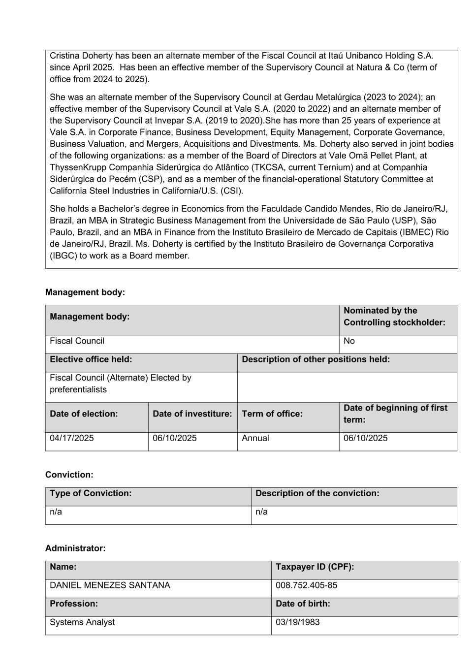 Cristina Doherty has been an alternate member of the Fiscal Council at Itaú Unibanco Holding S.A. since April 2025. Has been an effective member of the Supervisory Council at Natura & Co (term of office from 2024 to 2025). She was an alternate member of the Supervisory Council at Gerdau Metalúrgica (2023 to 2024); an effective member of the Supervisory Council at Vale S.A. (2020 to 2022) and an alternate member of the Supervisory Council at Invepar S.A. (2019 to 2020).She has more than 25 years of experience at Vale S.A. in Corporate Finance, Business Development, Equity Management, Corporate Governance, Business Valuation, and Mergers, Acquisitions and Divestments. Ms. Doherty also served in joint bodies of the following organizations: as a member of the Board of Directors at Vale Omã Pellet Plant, at ThyssenKrupp Companhia Siderúrgica do Atlântico (TKCSA, current Ternium) and at Companhia Siderúrgica do Pecém (CSP), and as a member of the financial-operational Statutory Committee at California Steel Industries in California/U.S. (CSI). She holds a Bachelor’s degree in Economics from the Faculdade Candido Mendes, Rio de Janeiro/RJ, Brazil, an MBA in Strategic Business Management from the Universidade de São Paulo (USP), São Paulo, Brazil, and an MBA in Finance from the Instituto Brasileiro de Mercado de Capitais (IBMEC) Rio de Janeiro/RJ, Brazil. Ms. Doherty is certified by the Instituto Brasileiro de Governança Corporativa (IBGC) to work as a Board member. Management body: Management body: Nominated by the Controlling stockholder: Fiscal Council No Elective office held: Description of other positions held: Fiscal Council (Alternate) Elected by preferentialists Date of election: Date of investiture: Term of office: Date of beginning of first term: 04/17/2025 06/10/2025 Annual 06/10/2025 Conviction: Type of Conviction: Description of the conviction: n/a n/a Administrator: Name: Taxpayer ID (CPF): DANIEL MENEZES SANTANA 008.752.405-85 Profession: Date of birth: Systems Analyst 03/19/1983