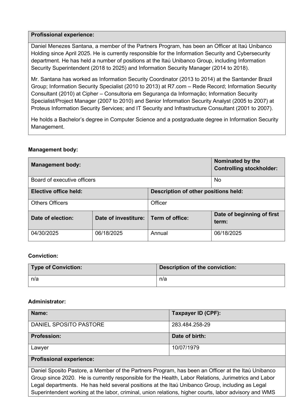 Profissional experience: Daniel Menezes Santana, a member of the Partners Program, has been an Officer at Itaú Unibanco Holding since April 2025. He is currently responsible for the Information Security and Cybersecurity department. He has held a number of positions at the Itaú Unibanco Group, including Information Security Superintendent (2018 to 2025) and Information Security Manager (2014 to 2018). Mr. Santana has worked as Information Security Coordinator (2013 to 2014) at the Santander Brazil Group; Information Security Specialist (2010 to 2013) at R7.com – Rede Record; Information Security Consultant (2010) at Cipher – Consultoria em Segurança da Informação; Information Security Specialist/Project Manager (2007 to 2010) and Senior Information Security Analyst (2005 to 2007) at Proteus Information Security Services; and IT Security and Infrastructure Consultant (2001 to 2007). He holds a Bachelor’s degree in Computer Science and a postgraduate degree in Information Security Management. Management body: Management body: Nominated by the Controlling stockholder: Board of executive officers No Elective office held: Description of other positions held: Others Officers Officer Date of election: Date of investiture: Term of office: Date of beginning of first term: 04/30/2025 06/18/2025 Annual 06/18/2025 Conviction: Type of Conviction: Description of the conviction: n/a n/a Administrator: Name: Taxpayer ID (CPF): DANIEL SPOSITO PASTORE 283.484.258-29 Profession: Date of birth: Lawyer 10/07/1979 Profissional experience: Daniel Sposito Pastore, a Member of the Partners Program, has been an Officer at the Itaú Unibanco Group since 2020. He is currently responsible for the Health, Labor Relations, Jurimetrics and Labor Legal departments. He has held several positions at the Itaú Unibanco Group, including as Legal Superintendent working at the labor, criminal, union relations, higher courts, labor advisory and WMS