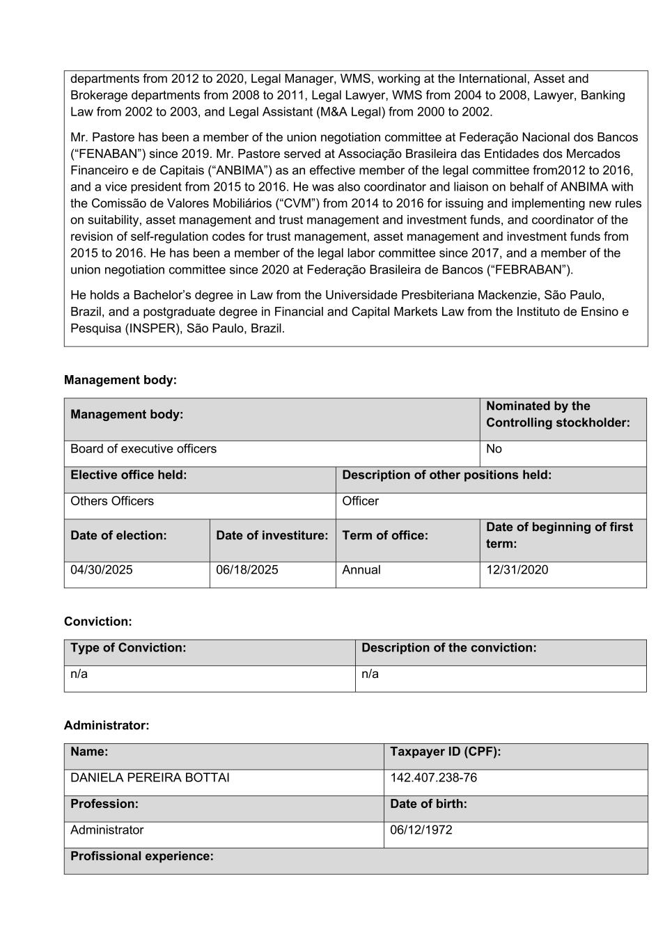 departments from 2012 to 2020, Legal Manager, WMS, working at the International, Asset and Brokerage departments from 2008 to 2011, Legal Lawyer, WMS from 2004 to 2008, Lawyer, Banking Law from 2002 to 2003, and Legal Assistant (M&A Legal) from 2000 to 2002. Mr. Pastore has been a member of the union negotiation committee at Federação Nacional dos Bancos (“FENABAN”) since 2019. Mr. Pastore served at Associação Brasileira das Entidades dos Mercados Financeiro e de Capitais (“ANBIMA”) as an effective member of the legal committee from2012 to 2016, and a vice president from 2015 to 2016. He was also coordinator and liaison on behalf of ANBIMA with the Comissão de Valores Mobiliários (“CVM”) from 2014 to 2016 for issuing and implementing new rules on suitability, asset management and trust management and investment funds, and coordinator of the revision of self-regulation codes for trust management, asset management and investment funds from 2015 to 2016. He has been a member of the legal labor committee since 2017, and a member of the union negotiation committee since 2020 at Federação Brasileira de Bancos (“FEBRABAN”). He holds a Bachelor’s degree in Law from the Universidade Presbiteriana Mackenzie, São Paulo, Brazil, and a postgraduate degree in Financial and Capital Markets Law from the Instituto de Ensino e Pesquisa (INSPER), São Paulo, Brazil. Management body: Management body: Nominated by the Controlling stockholder: Board of executive officers No Elective office held: Description of other positions held: Others Officers Officer Date of election: Date of investiture: Term of office: Date of beginning of first term: 04/30/2025 06/18/2025 Annual 12/31/2020 Conviction: Type of Conviction: Description of the conviction: n/a n/a Administrator: Name: Taxpayer ID (CPF): DANIELA PEREIRA BOTTAI 142.407.238-76 Profession: Date of birth: Administrator 06/12/1972 Profissional experience: