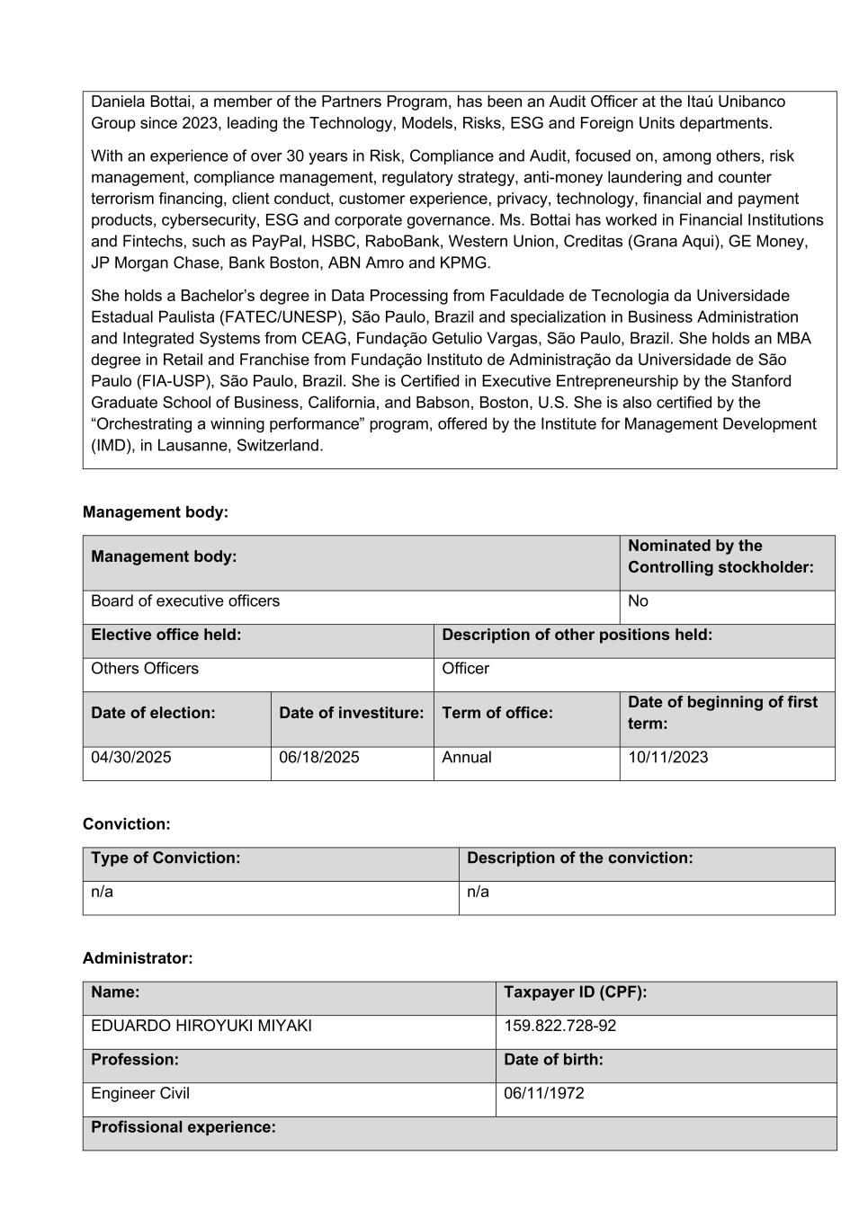 Daniela Bottai, a member of the Partners Program, has been an Audit Officer at the Itaú Unibanco Group since 2023, leading the Technology, Models, Risks, ESG and Foreign Units departments. With an experience of over 30 years in Risk, Compliance and Audit, focused on, among others, risk management, compliance management, regulatory strategy, anti-money laundering and counter terrorism financing, client conduct, customer experience, privacy, technology, financial and payment products, cybersecurity, ESG and corporate governance. Ms. Bottai has worked in Financial Institutions and Fintechs, such as PayPal, HSBC, RaboBank, Western Union, Creditas (Grana Aqui), GE Money, JP Morgan Chase, Bank Boston, ABN Amro and KPMG. She holds a Bachelor’s degree in Data Processing from Faculdade de Tecnologia da Universidade Estadual Paulista (FATEC/UNESP), São Paulo, Brazil and specialization in Business Administration and Integrated Systems from CEAG, Fundação Getulio Vargas, São Paulo, Brazil. She holds an MBA degree in Retail and Franchise from Fundação Instituto de Administração da Universidade de São Paulo (FIA-USP), São Paulo, Brazil. She is Certified in Executive Entrepreneurship by the Stanford Graduate School of Business, California, and Babson, Boston, U.S. She is also certified by the “Orchestrating a winning performance” program, offered by the Institute for Management Development (IMD), in Lausanne, Switzerland. Management body: Management body: Nominated by the Controlling stockholder: Board of executive officers No Elective office held: Description of other positions held: Others Officers Officer Date of election: Date of investiture: Term of office: Date of beginning of first term: 04/30/2025 06/18/2025 Annual 10/11/2023 Conviction: Type of Conviction: Description of the conviction: n/a n/a Administrator: Name: Taxpayer ID (CPF): EDUARDO HIROYUKI MIYAKI 159.822.728-92 Profession: Date of birth: Engineer Civil 06/11/1972 Profissional experience: