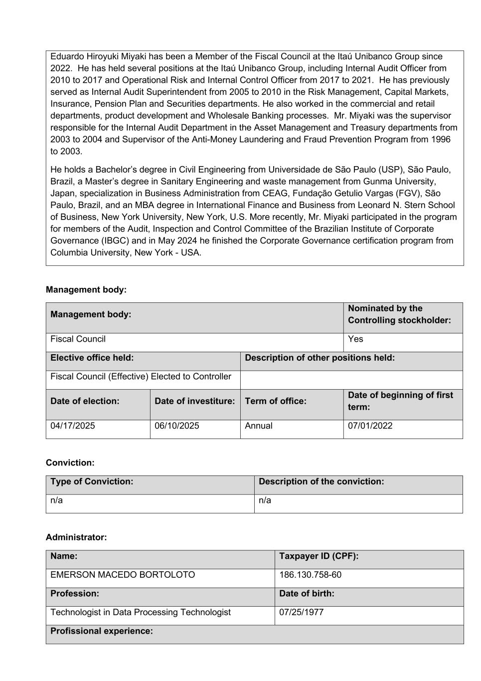 Eduardo Hiroyuki Miyaki has been a Member of the Fiscal Council at the Itaú Unibanco Group since 2022. He has held several positions at the Itaú Unibanco Group, including Internal Audit Officer from 2010 to 2017 and Operational Risk and Internal Control Officer from 2017 to 2021. He has previously served as Internal Audit Superintendent from 2005 to 2010 in the Risk Management, Capital Markets, Insurance, Pension Plan and Securities departments. He also worked in the commercial and retail departments, product development and Wholesale Banking processes. Mr. Miyaki was the supervisor responsible for the Internal Audit Department in the Asset Management and Treasury departments from 2003 to 2004 and Supervisor of the Anti-Money Laundering and Fraud Prevention Program from 1996 to 2003. He holds a Bachelor’s degree in Civil Engineering from Universidade de São Paulo (USP), São Paulo, Brazil, a Master’s degree in Sanitary Engineering and waste management from Gunma University, Japan, specialization in Business Administration from CEAG, Fundação Getulio Vargas (FGV), São Paulo, Brazil, and an MBA degree in International Finance and Business from Leonard N. Stern School of Business, New York University, New York, U.S. More recently, Mr. Miyaki participated in the program for members of the Audit, Inspection and Control Committee of the Brazilian Institute of Corporate Governance (IBGC) and in May 2024 he finished the Corporate Governance certification program from Columbia University, New York - USA. Management body: Management body: Nominated by the Controlling stockholder: Fiscal Council Yes Elective office held: Description of other positions held: Fiscal Council (Effective) Elected to Controller Date of election: Date of investiture: Term of office: Date of beginning of first term: 04/17/2025 06/10/2025 Annual 07/01/2022 Conviction: Type of Conviction: Description of the conviction: n/a n/a Administrator: Name: Taxpayer ID (CPF): EMERSON MACEDO BORTOLOTO 186.130.758-60 Profession: Date of birth: Technologist in Data Processing Technologist 07/25/1977 Profissional experience: