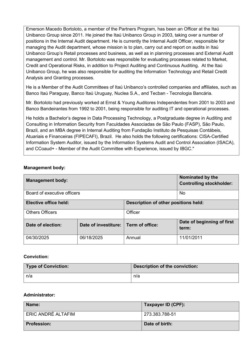 Emerson Macedo Bortoloto, a member of the Partners Program, has been an Officer at the Itaú Unibanco Group since 2011. He joined the Itaú Unibanco Group in 2003, taking over a number of positions in the Internal Audit department. He is currently the Internal Audit Officer, responsible for managing the Audit department, whose mission is to plan, carry out and report on audits in Itaú Unibanco Group’s Retail processes and business, as well as in planning processes and External Audit management and control. Mr. Bortoloto was responsible for evaluating processes related to Market, Credit and Operational Risks, in addition to Project Auditing and Continuous Auditing. At the Itaú Unibanco Group, he was also responsible for auditing the Information Technology and Retail Credit Analysis and Granting processes. He is a Member of the Audit Committees of Itaú Unibanco’s controlled companies and affiliates, such as Banco Itaú Paraguay, Banco Itaú Uruguay, Nuclea S.A., and Tecban - Tecnologia Bancária. Mr. Bortoloto had previously worked at Ernst & Young Auditores Independentes from 2001 to 2003 and Banco Bandeirantes from 1992 to 2001, being responsible for auditing IT and operational processes. He holds a Bachelor’s degree in Data Processing Technology, a Postgraduate degree in Auditing and Consulting in Information Security from Faculdades Associadas de São Paulo (FASP), São Paulo, Brazil, and an MBA degree in Internal Auditing from Fundação Instituto de Pesquisas Contábeis, Atuariais e Financeiras (FIPECAFI), Brazil. He also holds the following certifications: CISA-Certified Information System Auditor, issued by the Information Systems Audit and Control Association (ISACA), and CCoaud+ - Member of the Audit Committee with Experience, issued by IBGC." Management body: Management body: Nominated by the Controlling stockholder: Board of executive officers No Elective office held: Description of other positions held: Others Officers Officer Date of election: Date of investiture: Term of office: Date of beginning of first term: 04/30/2025 06/18/2025 Annual 11/01/2011 Conviction: Type of Conviction: Description of the conviction: n/a n/a Administrator: Name: Taxpayer ID (CPF): ERIC ANDRÉ ALTAFIM 273.383.788-51 Profession: Date of birth: