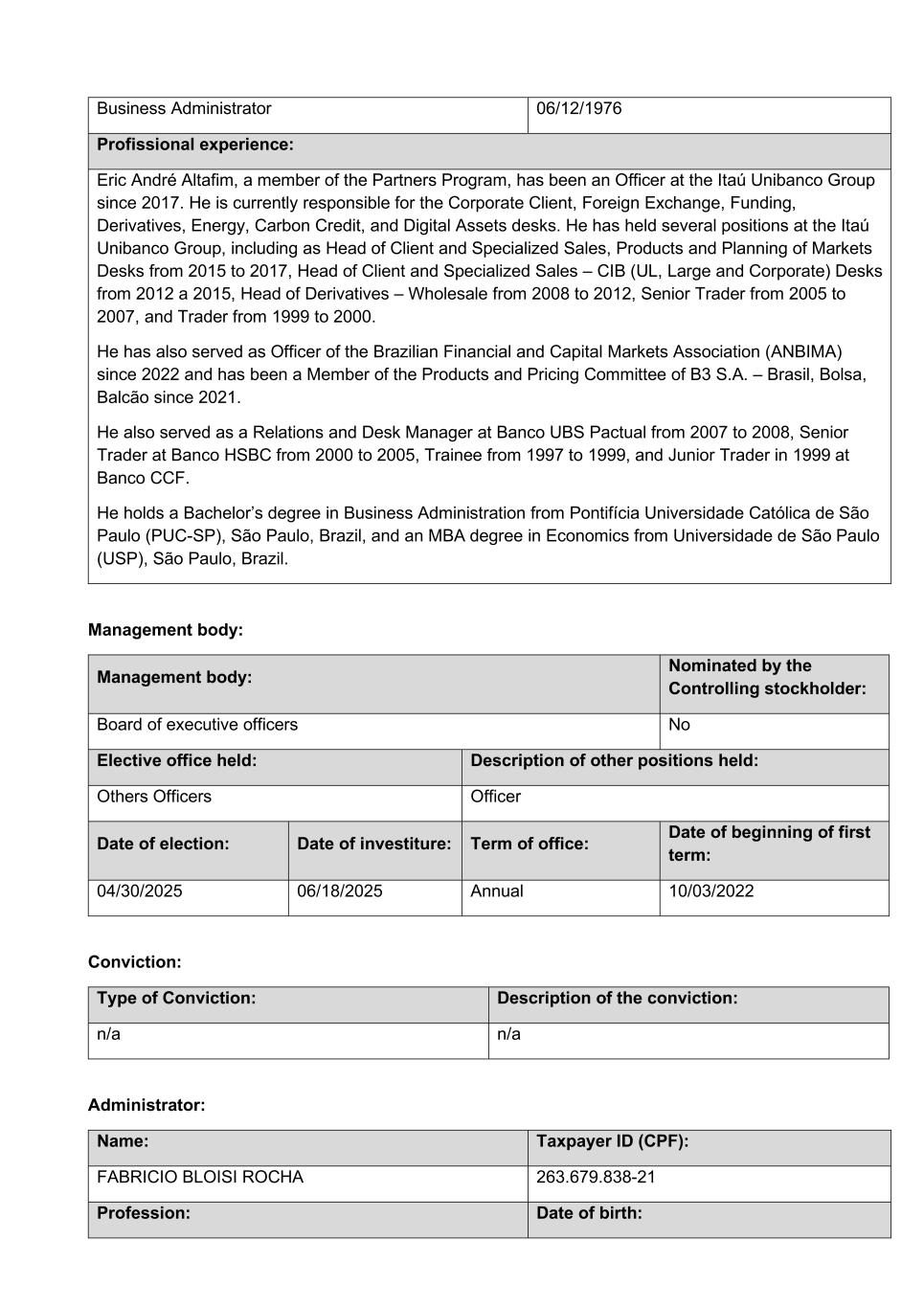 Business Administrator 06/12/1976 Profissional experience: Eric André Altafim, a member of the Partners Program, has been an Officer at the Itaú Unibanco Group since 2017. He is currently responsible for the Corporate Client, Foreign Exchange, Funding, Derivatives, Energy, Carbon Credit, and Digital Assets desks. He has held several positions at the Itaú Unibanco Group, including as Head of Client and Specialized Sales, Products and Planning of Markets Desks from 2015 to 2017, Head of Client and Specialized Sales – CIB (UL, Large and Corporate) Desks from 2012 a 2015, Head of Derivatives – Wholesale from 2008 to 2012, Senior Trader from 2005 to 2007, and Trader from 1999 to 2000. He has also served as Officer of the Brazilian Financial and Capital Markets Association (ANBIMA) since 2022 and has been a Member of the Products and Pricing Committee of B3 S.A. – Brasil, Bolsa, Balcão since 2021. He also served as a Relations and Desk Manager at Banco UBS Pactual from 2007 to 2008, Senior Trader at Banco HSBC from 2000 to 2005, Trainee from 1997 to 1999, and Junior Trader in 1999 at Banco CCF. He holds a Bachelor’s degree in Business Administration from Pontifícia Universidade Católica de São Paulo (PUC-SP), São Paulo, Brazil, and an MBA degree in Economics from Universidade de São Paulo (USP), São Paulo, Brazil. Management body: Management body: Nominated by the Controlling stockholder: Board of executive officers No Elective office held: Description of other positions held: Others Officers Officer Date of election: Date of investiture: Term of office: Date of beginning of first term: 04/30/2025 06/18/2025 Annual 10/03/2022 Conviction: Type of Conviction: Description of the conviction: n/a n/a Administrator: Name: Taxpayer ID (CPF): FABRICIO BLOISI ROCHA 263.679.838-21 Profession: Date of birth: