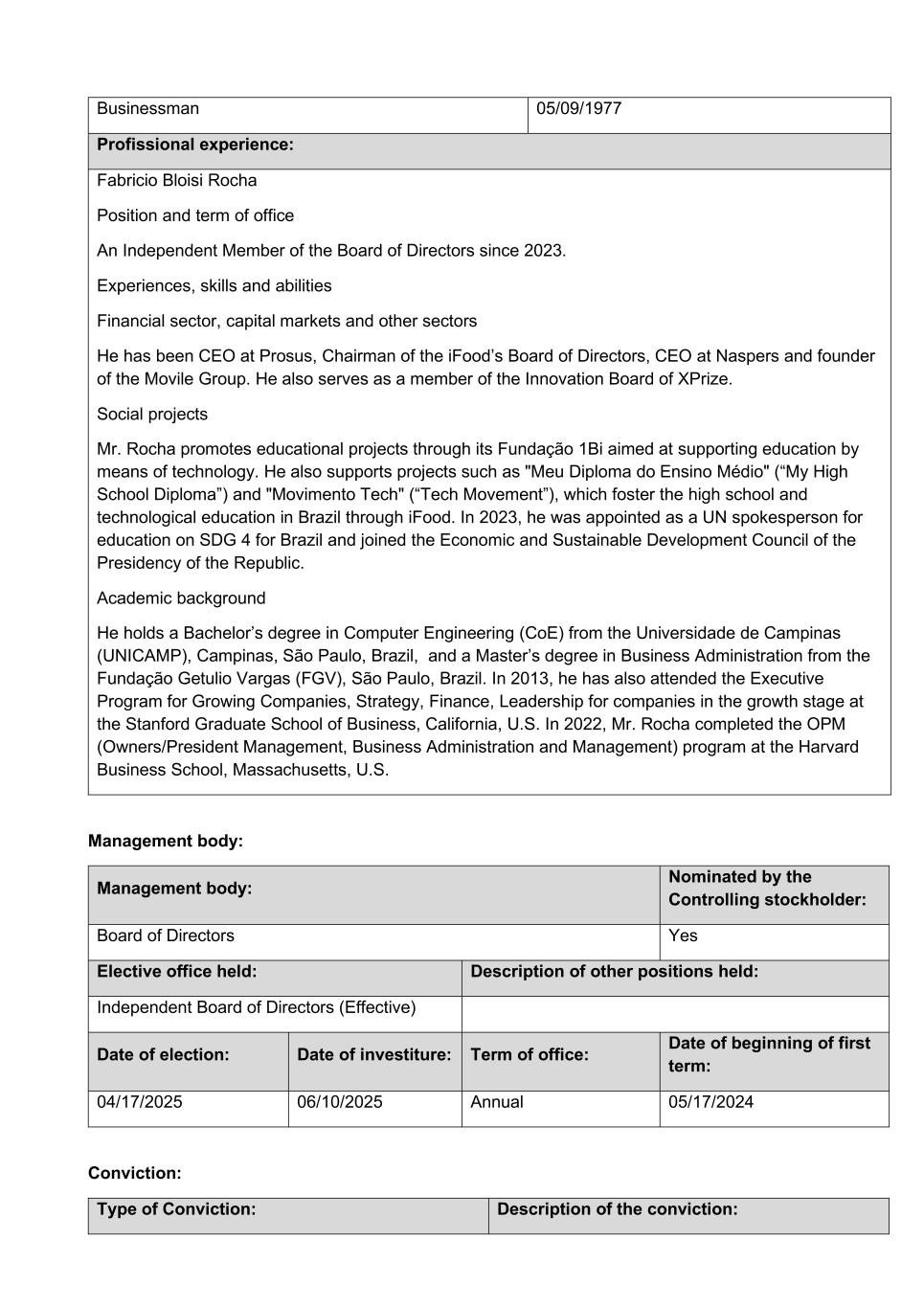 Businessman 05/09/1977 Profissional experience: Fabricio Bloisi Rocha Position and term of office An Independent Member of the Board of Directors since 2023. Experiences, skills and abilities Financial sector, capital markets and other sectors He has been CEO at Prosus, Chairman of the iFood’s Board of Directors, CEO at Naspers and founder of the Movile Group. He also serves as a member of the Innovation Board of XPrize. Social projects Mr. Rocha promotes educational projects through its Fundação 1Bi aimed at supporting education by means of technology. He also supports projects such as "Meu Diploma do Ensino Médio" (“My High School Diploma”) and "Movimento Tech" (“Tech Movement”), which foster the high school and technological education in Brazil through iFood. In 2023, he was appointed as a UN spokesperson for education on SDG 4 for Brazil and joined the Economic and Sustainable Development Council of the Presidency of the Republic. Academic background He holds a Bachelor’s degree in Computer Engineering (CoE) from the Universidade de Campinas (UNICAMP), Campinas, São Paulo, Brazil, and a Master’s degree in Business Administration from the Fundação Getulio Vargas (FGV), São Paulo, Brazil. In 2013, he has also attended the Executive Program for Growing Companies, Strategy, Finance, Leadership for companies in the growth stage at the Stanford Graduate School of Business, California, U.S. In 2022, Mr. Rocha completed the OPM (Owners/President Management, Business Administration and Management) program at the Harvard Business School, Massachusetts, U.S. Management body: Management body: Nominated by the Controlling stockholder: Board of Directors Yes Elective office held: Description of other positions held: Independent Board of Directors (Effective) Date of election: Date of investiture: Term of office: Date of beginning of first term: 04/17/2025 06/10/2025 Annual 05/17/2024 Conviction: Type of Conviction: Description of the conviction: