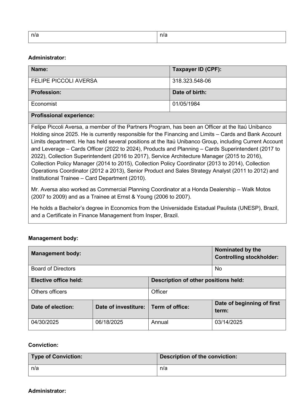 n/a n/a Administrator: Name: Taxpayer ID (CPF): FELIPE PICCOLI AVERSA 318.323.548-06 Profession: Date of birth: Economist 01/05/1984 Profissional experience: Felipe Piccoli Aversa, a member of the Partners Program, has been an Officer at the Itaú Unibanco Holding since 2025. He is currently responsible for the Financing and Limits – Cards and Bank Account Limits department. He has held several positions at the Itaú Unibanco Group, including Current Account and Leverage – Cards Officer (2022 to 2024), Products and Planning – Cards Superintendent (2017 to 2022), Collection Superintendent (2016 to 2017), Service Architecture Manager (2015 to 2016), Collection Policy Manager (2014 to 2015), Collection Policy Coordinator (2013 to 2014), Collection Operations Coordinator (2012 a 2013), Senior Product and Sales Strategy Analyst (2011 to 2012) and Institutional Trainee – Card Department (2010). Mr. Aversa also worked as Commercial Planning Coordinator at a Honda Dealership – Walk Motos (2007 to 2009) and as a Trainee at Ernst & Young (2006 to 2007). He holds a Bachelor’s degree in Economics from the Universidade Estadual Paulista (UNESP), Brazil, and a Certificate in Finance Management from Insper, Brazil. Management body: Management body: Nominated by the Controlling stockholder: Board of Directors No Elective office held: Description of other positions held: Others officers Officer Date of election: Date of investiture: Term of office: Date of beginning of first term: 04/30/2025 06/18/2025 Annual 03/14/2025 Conviction: Type of Conviction: Description of the conviction: n/a n/a Administrator: