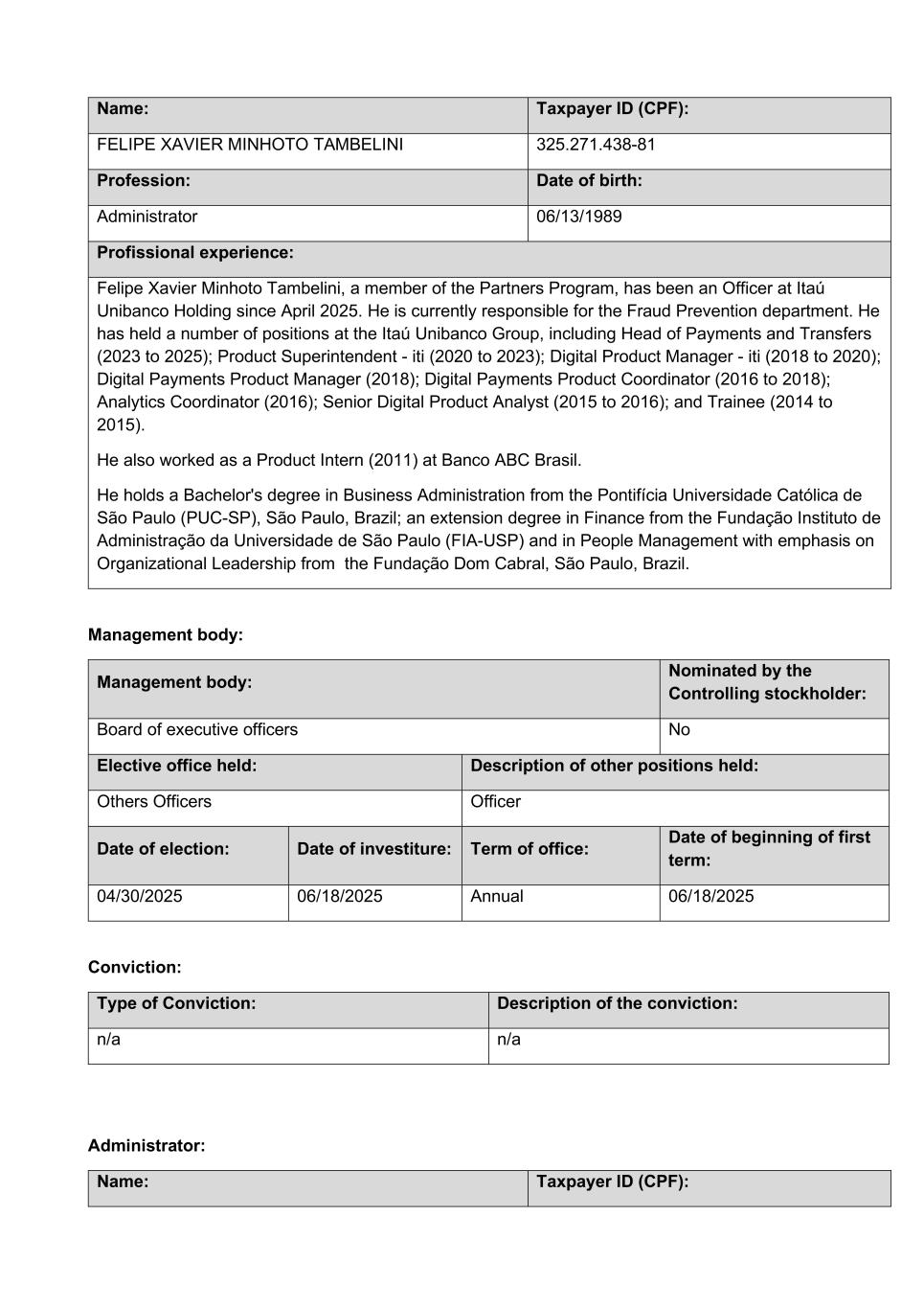 Name: Taxpayer ID (CPF): FELIPE XAVIER MINHOTO TAMBELINI 325.271.438-81 Profession: Date of birth: Administrator 06/13/1989 Profissional experience: Felipe Xavier Minhoto Tambelini, a member of the Partners Program, has been an Officer at Itaú Unibanco Holding since April 2025. He is currently responsible for the Fraud Prevention department. He has held a number of positions at the Itaú Unibanco Group, including Head of Payments and Transfers (2023 to 2025); Product Superintendent - iti (2020 to 2023); Digital Product Manager - iti (2018 to 2020); Digital Payments Product Manager (2018); Digital Payments Product Coordinator (2016 to 2018); Analytics Coordinator (2016); Senior Digital Product Analyst (2015 to 2016); and Trainee (2014 to 2015). He also worked as a Product Intern (2011) at Banco ABC Brasil. He holds a Bachelor's degree in Business Administration from the Pontifícia Universidade Católica de São Paulo (PUC-SP), São Paulo, Brazil; an extension degree in Finance from the Fundação Instituto de Administração da Universidade de São Paulo (FIA-USP) and in People Management with emphasis on Organizational Leadership from the Fundação Dom Cabral, São Paulo, Brazil. Management body: Management body: Nominated by the Controlling stockholder: Board of executive officers No Elective office held: Description of other positions held: Others Officers Officer Date of election: Date of investiture: Term of office: Date of beginning of first term: 04/30/2025 06/18/2025 Annual 06/18/2025 Conviction: Type of Conviction: Description of the conviction: n/a n/a Administrator: Name: Taxpayer ID (CPF):