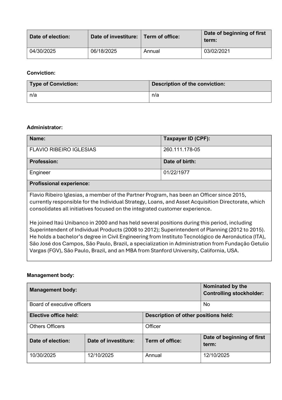 Date of election: Date of investiture: Term of office: Date of beginning of first term: 04/30/2025 06/18/2025 Annual 03/02/2021 Conviction: Type of Conviction: Description of the conviction: n/a n/a Administrator: Name: Taxpayer ID (CPF): FLAVIO RIBEIRO IGLESIAS 260.111.178-05 Profession: Date of birth: Engineer 01/22/1977 Profissional experience: Flavio Ribeiro Iglesias, a member of the Partner Program, has been an Officer since 2015, currently responsible for the Individual Strategy, Loans, and Asset Acquisition Directorate, which consolidates all initiatives focused on the integrated customer experience. He joined Itaú Unibanco in 2000 and has held several positions during this period, including Superintendent of Individual Products (2008 to 2012); Superintendent of Planning (2012 to 2015). He holds a bachelor’s degree in Civil Engineering from Instituto Tecnológico de Aeronáutica (ITA), São José dos Campos, São Paulo, Brazil, a specialization in Administration from Fundação Getulio Vargas (FGV), São Paulo, Brazil, and an MBA from Stanford University, California, USA. Management body: Management body: Nominated by the Controlling stockholder: Board of executive officers No Elective office held: Description of other positions held: Others Officers Officer Date of election: Date of investiture: Term of office: Date of beginning of first term: 10/30/2025 12/10/2025 Annual 12/10/2025
