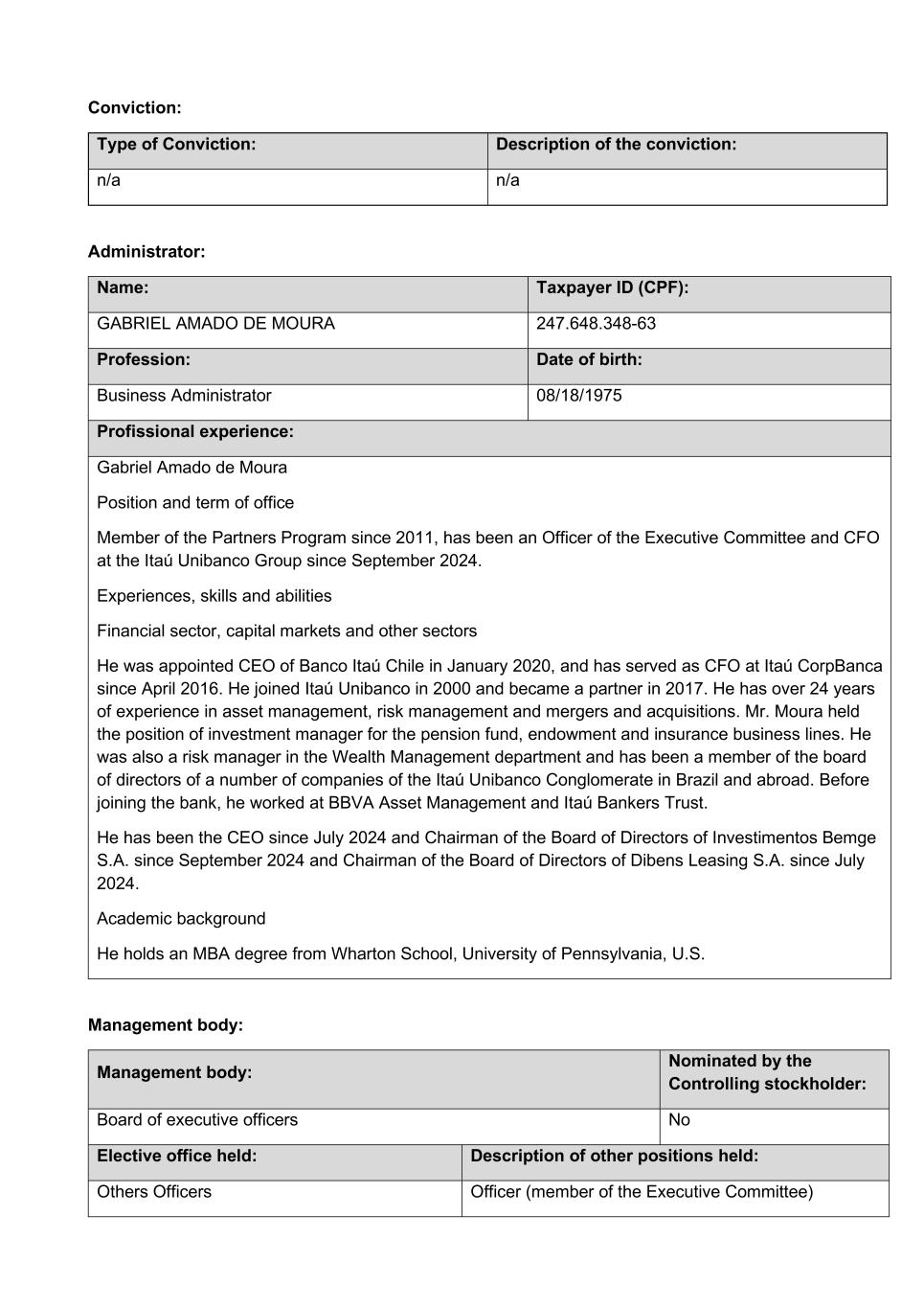 Conviction: Type of Conviction: Description of the conviction: n/a n/a Administrator: Name: Taxpayer ID (CPF): GABRIEL AMADO DE MOURA 247.648.348-63 Profession: Date of birth: Business Administrator 08/18/1975 Profissional experience: Gabriel Amado de Moura Position and term of office Member of the Partners Program since 2011, has been an Officer of the Executive Committee and CFO at the Itaú Unibanco Group since September 2024. Experiences, skills and abilities Financial sector, capital markets and other sectors He was appointed CEO of Banco Itaú Chile in January 2020, and has served as CFO at Itaú CorpBanca since April 2016. He joined Itaú Unibanco in 2000 and became a partner in 2017. He has over 24 years of experience in asset management, risk management and mergers and acquisitions. Mr. Moura held the position of investment manager for the pension fund, endowment and insurance business lines. He was also a risk manager in the Wealth Management department and has been a member of the board of directors of a number of companies of the Itaú Unibanco Conglomerate in Brazil and abroad. Before joining the bank, he worked at BBVA Asset Management and Itaú Bankers Trust. He has been the CEO since July 2024 and Chairman of the Board of Directors of Investimentos Bemge S.A. since September 2024 and Chairman of the Board of Directors of Dibens Leasing S.A. since July 2024. Academic background He holds an MBA degree from Wharton School, University of Pennsylvania, U.S. Management body: Management body: Nominated by the Controlling stockholder: Board of executive officers No Elective office held: Description of other positions held: Others Officers Officer (member of the Executive Committee)
