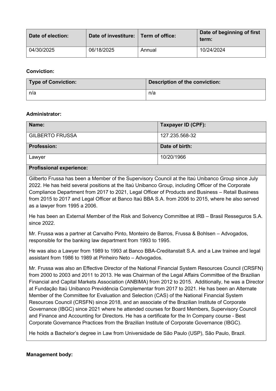 Date of election: Date of investiture: Term of office: Date of beginning of first term: 04/30/2025 06/18/2025 Annual 10/24/2024 Conviction: Type of Conviction: Description of the conviction: n/a n/a Administrator: Name: Taxpayer ID (CPF): GILBERTO FRUSSA 127.235.568-32 Profession: Date of birth: Lawyer 10/20/1966 Profissional experience: Gilberto Frussa has been a Member of the Supervisory Council at the Itaú Unibanco Group since July 2022. He has held several positions at the Itaú Unibanco Group, including Officer of the Corporate Compliance Department from 2017 to 2021, Legal Officer of Products and Business – Retail Business from 2015 to 2017 and Legal Officer at Banco Itaú BBA S.A. from 2006 to 2015, where he also served as a lawyer from 1995 a 2006. He has been an External Member of the Risk and Solvency Committee at IRB – Brasil Resseguros S.A. since 2022. Mr. Frussa was a partner at Carvalho Pinto, Monteiro de Barros, Frussa & Bohlsen – Advogados, responsible for the banking law department from 1993 to 1995. He was also a Lawyer from 1989 to 1993 at Banco BBA-Creditanstalt S.A. and a Law trainee and legal assistant from 1986 to 1989 at Pinheiro Neto – Advogados. Mr. Frussa was also an Effective Director of the National Financial System Resources Council (CRSFN) from 2000 to 2003 and 2011 to 2013. He was Chairman of the Legal Affairs Committee of the Brazilian Financial and Capital Markets Association (ANBIMA) from 2012 to 2015. Additionally, he was a Director at Fundação Itaú Unibanco Previdência Complementar from 2017 to 2021. He has been an Alternate Member of the Committee for Evaluation and Selection (CAS) of the National Financial System Resources Council (CRSFN) since 2018, and an associate of the Brazilian Institute of Corporate Governance (IBGC) since 2021 where he attended courses for Board Members, Supervisory Council and Finance and Accounting for Directors. He has a certificate for the In Company course - Best Corporate Governance Practices from the Brazilian Institute of Corporate Governance (IBGC). He holds a Bachelor’s degree in Law from Universidade de São Paulo (USP), São Paulo, Brazil. Management body: