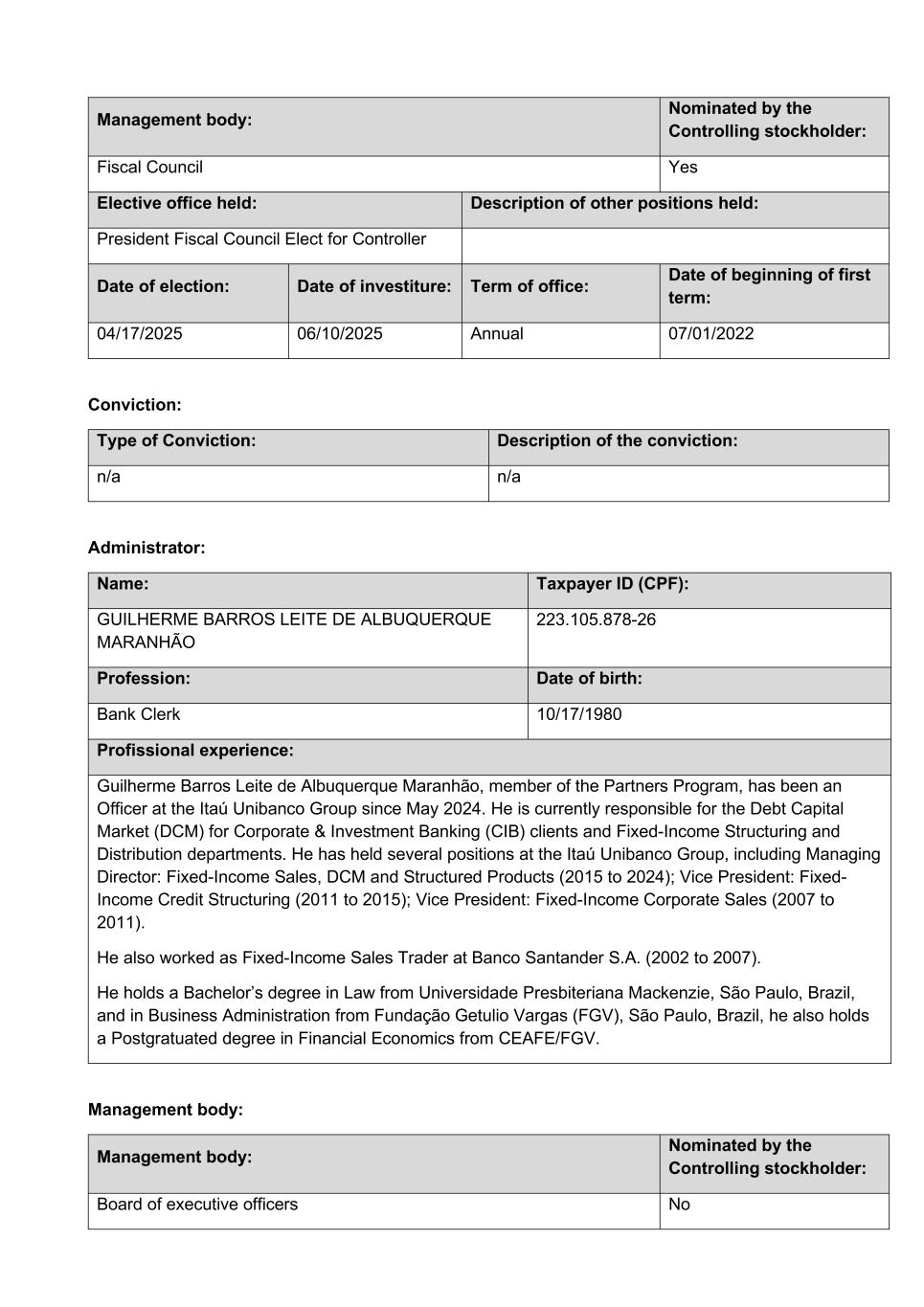 Management body: Nominated by the Controlling stockholder: Fiscal Council Yes Elective office held: Description of other positions held: President Fiscal Council Elect for Controller Date of election: Date of investiture: Term of office: Date of beginning of first term: 04/17/2025 06/10/2025 Annual 07/01/2022 Conviction: Type of Conviction: Description of the conviction: n/a n/a Administrator: Name: Taxpayer ID (CPF): GUILHERME BARROS LEITE DE ALBUQUERQUE MARANHÃO 223.105.878-26 Profession: Date of birth: Bank Clerk 10/17/1980 Profissional experience: Guilherme Barros Leite de Albuquerque Maranhão, member of the Partners Program, has been an Officer at the Itaú Unibanco Group since May 2024. He is currently responsible for the Debt Capital Market (DCM) for Corporate & Investment Banking (CIB) clients and Fixed-Income Structuring and Distribution departments. He has held several positions at the Itaú Unibanco Group, including Managing Director: Fixed-Income Sales, DCM and Structured Products (2015 to 2024); Vice President: Fixed- Income Credit Structuring (2011 to 2015); Vice President: Fixed-Income Corporate Sales (2007 to 2011). He also worked as Fixed-Income Sales Trader at Banco Santander S.A. (2002 to 2007). He holds a Bachelor’s degree in Law from Universidade Presbiteriana Mackenzie, São Paulo, Brazil, and in Business Administration from Fundação Getulio Vargas (FGV), São Paulo, Brazil, he also holds a Postgratuated degree in Financial Economics from CEAFE/FGV. Management body: Management body: Nominated by the Controlling stockholder: Board of executive officers No