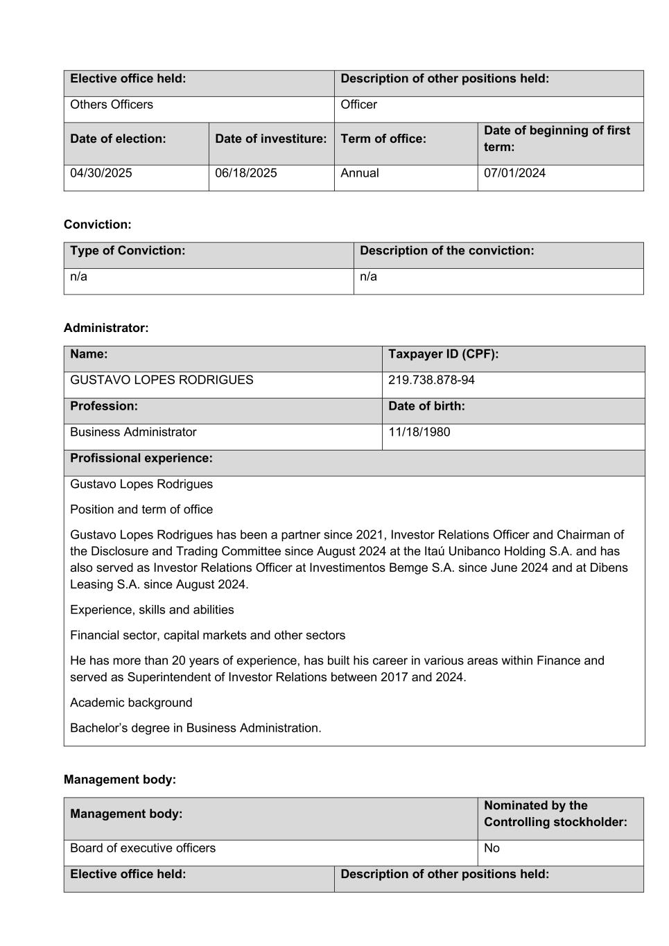 Elective office held: Description of other positions held: Others Officers Officer Date of election: Date of investiture: Term of office: Date of beginning of first term: 04/30/2025 06/18/2025 Annual 07/01/2024 Conviction: Type of Conviction: Description of the conviction: n/a n/a Administrator: Name: Taxpayer ID (CPF): GUSTAVO LOPES RODRIGUES 219.738.878-94 Profession: Date of birth: Business Administrator 11/18/1980 Profissional experience: Gustavo Lopes Rodrigues Position and term of office Gustavo Lopes Rodrigues has been a partner since 2021, Investor Relations Officer and Chairman of the Disclosure and Trading Committee since August 2024 at the Itaú Unibanco Holding S.A. and has also served as Investor Relations Officer at Investimentos Bemge S.A. since June 2024 and at Dibens Leasing S.A. since August 2024. Experience, skills and abilities Financial sector, capital markets and other sectors He has more than 20 years of experience, has built his career in various areas within Finance and served as Superintendent of Investor Relations between 2017 and 2024. Academic background Bachelor’s degree in Business Administration. Management body: Management body: Nominated by the Controlling stockholder: Board of executive officers No Elective office held: Description of other positions held:
