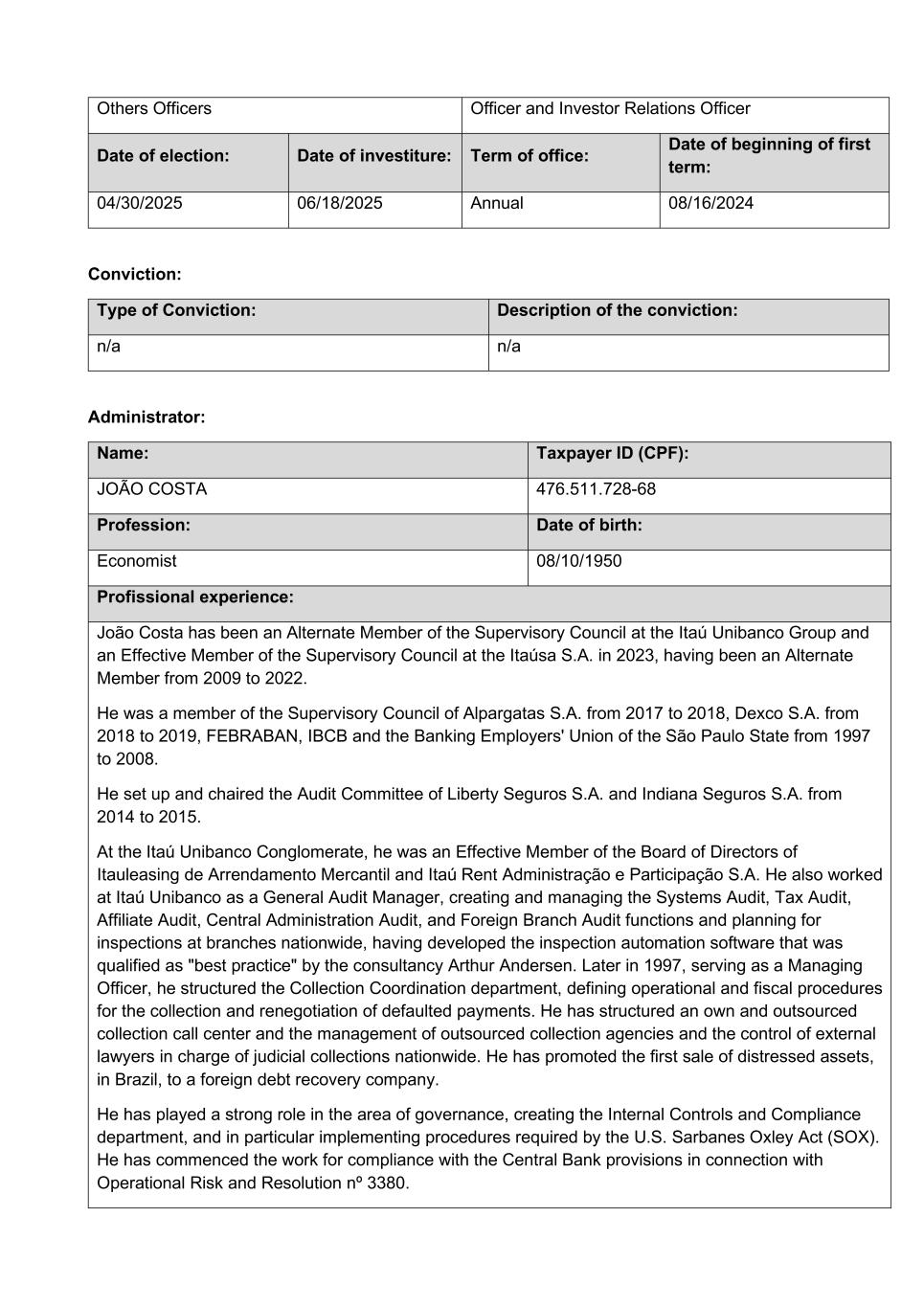 Others Officers Officer and Investor Relations Officer Date of election: Date of investiture: Term of office: Date of beginning of first term: 04/30/2025 06/18/2025 Annual 08/16/2024 Conviction: Type of Conviction: Description of the conviction: n/a n/a Administrator: Name: Taxpayer ID (CPF): JOÃO COSTA 476.511.728-68 Profession: Date of birth: Economist 08/10/1950 Profissional experience: João Costa has been an Alternate Member of the Supervisory Council at the Itaú Unibanco Group and an Effective Member of the Supervisory Council at the Itaúsa S.A. in 2023, having been an Alternate Member from 2009 to 2022. He was a member of the Supervisory Council of Alpargatas S.A. from 2017 to 2018, Dexco S.A. from 2018 to 2019, FEBRABAN, IBCB and the Banking Employers' Union of the São Paulo State from 1997 to 2008. He set up and chaired the Audit Committee of Liberty Seguros S.A. and Indiana Seguros S.A. from 2014 to 2015. At the Itaú Unibanco Conglomerate, he was an Effective Member of the Board of Directors of Itauleasing de Arrendamento Mercantil and Itaú Rent Administração e Participação S.A. He also worked at Itaú Unibanco as a General Audit Manager, creating and managing the Systems Audit, Tax Audit, Affiliate Audit, Central Administration Audit, and Foreign Branch Audit functions and planning for inspections at branches nationwide, having developed the inspection automation software that was qualified as "best practice" by the consultancy Arthur Andersen. Later in 1997, serving as a Managing Officer, he structured the Collection Coordination department, defining operational and fiscal procedures for the collection and renegotiation of defaulted payments. He has structured an own and outsourced collection call center and the management of outsourced collection agencies and the control of external lawyers in charge of judicial collections nationwide. He has promoted the first sale of distressed assets, in Brazil, to a foreign debt recovery company. He has played a strong role in the area of governance, creating the Internal Controls and Compliance department, and in particular implementing procedures required by the U.S. Sarbanes Oxley Act (SOX). He has commenced the work for compliance with the Central Bank provisions in connection with Operational Risk and Resolution nº 3380.