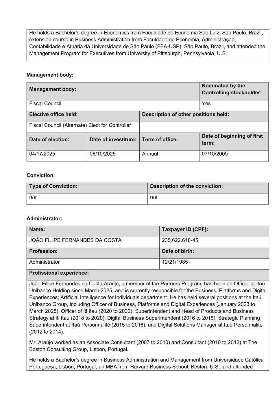He holds a Bachelor’s degree in Economics from Faculdade de Economia São Luiz, São Paulo, Brazil, extension course in Business Administration from Faculdade de Economia, Administração, Contabilidade e Atuária da Universidade de São Paulo (FEA-USP), São Paulo, Brazil, and attended the Management Program for Executives from University of Pittsburgh, Pennsylvania, U.S. Management body: Management body: Nominated by the Controlling stockholder: Fiscal Council Yes Elective office held: Description of other positions held: Fiscal Council (Alternate) Elect for Controller Date of election: Date of investiture: Term of office: Date of beginning of first term: 04/17/2025 06/10/2025 Annual 07/10/2009 Conviction: Type of Conviction: Description of the conviction: n/a n/a Administrator: Name: Taxpayer ID (CPF): JOÃO FILIPE FERNANDES DA COSTA 235.622.618-45 Profession: Date of birth: Administrator 12/21/1985 Profissional experience: João Filipe Fernandes da Costa Araújo, a member of the Partners Program, has been an Officer at Itaú Unibanco Holding since March 2025, and is currently responsible for the Business, Platforms and Digital Experiences; Artificial Intelligence for Individuals department. He has held several positions at the Itaú Unibanco Group, including Officer of Business, Platforms and Digital Experiences (January 2023 to March 2025), Officer of iti Itaú (2020 to 2022), Superintendent and Head of Products and Business Strategy at iti Itaú (2018 to 2020), Digital Business Superintendent (2016 to 2018), Strategic Planning Superintendent at Itaú Personnalité (2015 to 2016), and Digital Solutions Manager at Itaú Personnalité (2012 to 2014). Mr. Araújo worked as an Associate Consultant (2007 to 2010) and Consultant (2010 to 2012) at The Boston Consulting Group, Lisbon, Portugal. He holds a Bachelor’s degree in Business Administration and Management from Universidade Católica Portuguesa, Lisbon, Portugal, an MBA from Harvard Business School, Boston, U.S., and attended