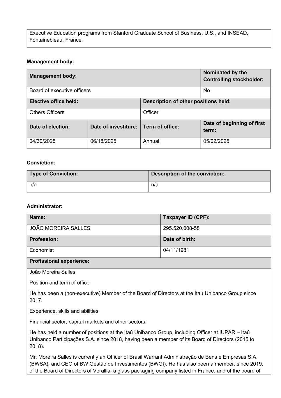 Executive Education programs from Stanford Graduate School of Business, U.S., and INSEAD, Fontainebleau, France. Management body: Management body: Nominated by the Controlling stockholder: Board of executive officers No Elective office held: Description of other positions held: Others Officers Officer Date of election: Date of investiture: Term of office: Date of beginning of first term: 04/30/2025 06/18/2025 Annual 05/02/2025 Conviction: Type of Conviction: Description of the conviction: n/a n/a Administrator: Name: Taxpayer ID (CPF): JOÃO MOREIRA SALLES 295.520.008-58 Profession: Date of birth: Economist 04/11/1981 Profissional experience: João Moreira Salles Position and term of office He has been a (non-executive) Member of the Board of Directors at the Itaú Unibanco Group since 2017. Experience, skills and abilities Financial sector, capital markets and other sectors He has held a number of positions at the Itaú Unibanco Group, including Officer at IUPAR – Itaú Unibanco Participações S.A. since 2018, having been a member of its Board of Directors (2015 to 2018). Mr. Moreira Salles is currently an Officer of Brasil Warrant Administração de Bens e Empresas S.A. (BWSA), and CEO of BW Gestão de Investimentos (BWGI). He has also been a member, since 2019, of the Board of Directors of Verallia, a glass packaging company listed in France, and of the board of