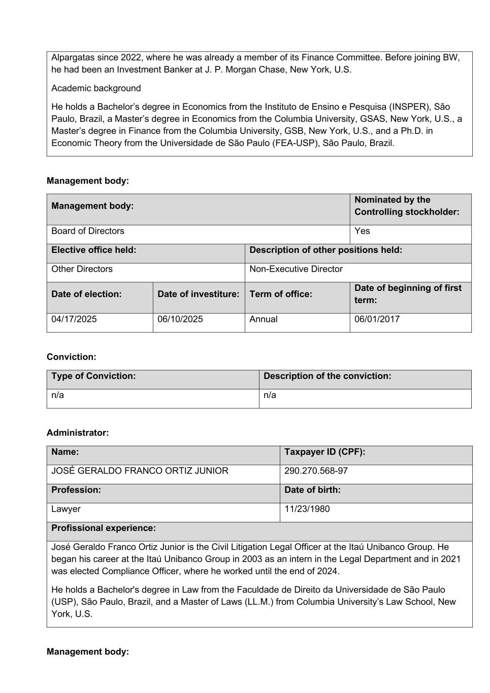 Alpargatas since 2022, where he was already a member of its Finance Committee. Before joining BW, he had been an Investment Banker at J. P. Morgan Chase, New York, U.S. Academic background He holds a Bachelor’s degree in Economics from the Instituto de Ensino e Pesquisa (INSPER), São Paulo, Brazil, a Master’s degree in Economics from the Columbia University, GSAS, New York, U.S., a Master’s degree in Finance from the Columbia University, GSB, New York, U.S., and a Ph.D. in Economic Theory from the Universidade de São Paulo (FEA-USP), São Paulo, Brazil. Management body: Management body: Nominated by the Controlling stockholder: Board of Directors Yes Elective office held: Description of other positions held: Other Directors Non-Executive Director Date of election: Date of investiture: Term of office: Date of beginning of first term: 04/17/2025 06/10/2025 Annual 06/01/2017 Conviction: Type of Conviction: Description of the conviction: n/a n/a Administrator: Name: Taxpayer ID (CPF): JOSÉ GERALDO FRANCO ORTIZ JUNIOR 290.270.568-97 Profession: Date of birth: Lawyer 11/23/1980 Profissional experience: José Geraldo Franco Ortiz Junior is the Civil Litigation Legal Officer at the Itaú Unibanco Group. He began his career at the Itaú Unibanco Group in 2003 as an intern in the Legal Department and in 2021 was elected Compliance Officer, where he worked until the end of 2024. He holds a Bachelor's degree in Law from the Faculdade de Direito da Universidade de São Paulo (USP), São Paulo, Brazil, and a Master of Laws (LL.M.) from Columbia University’s Law School, New York, U.S. Management body: