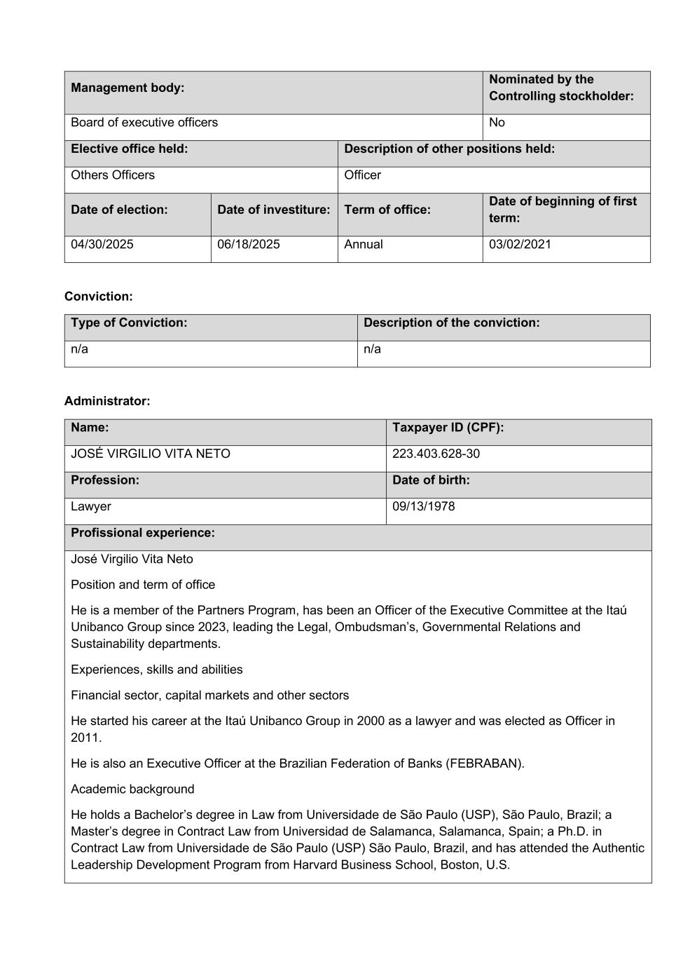 Management body: Nominated by the Controlling stockholder: Board of executive officers No Elective office held: Description of other positions held: Others Officers Officer Date of election: Date of investiture: Term of office: Date of beginning of first term: 04/30/2025 06/18/2025 Annual 03/02/2021 Conviction: Type of Conviction: Description of the conviction: n/a n/a Administrator: Name: Taxpayer ID (CPF): JOSÉ VIRGILIO VITA NETO 223.403.628-30 Profession: Date of birth: Lawyer 09/13/1978 Profissional experience: José Virgilio Vita Neto Position and term of office He is a member of the Partners Program, has been an Officer of the Executive Committee at the Itaú Unibanco Group since 2023, leading the Legal, Ombudsman’s, Governmental Relations and Sustainability departments. Experiences, skills and abilities Financial sector, capital markets and other sectors He started his career at the Itaú Unibanco Group in 2000 as a lawyer and was elected as Officer in 2011. He is also an Executive Officer at the Brazilian Federation of Banks (FEBRABAN). Academic background He holds a Bachelor’s degree in Law from Universidade de São Paulo (USP), São Paulo, Brazil; a Master’s degree in Contract Law from Universidad de Salamanca, Salamanca, Spain; a Ph.D. in Contract Law from Universidade de São Paulo (USP) São Paulo, Brazil, and has attended the Authentic Leadership Development Program from Harvard Business School, Boston, U.S.