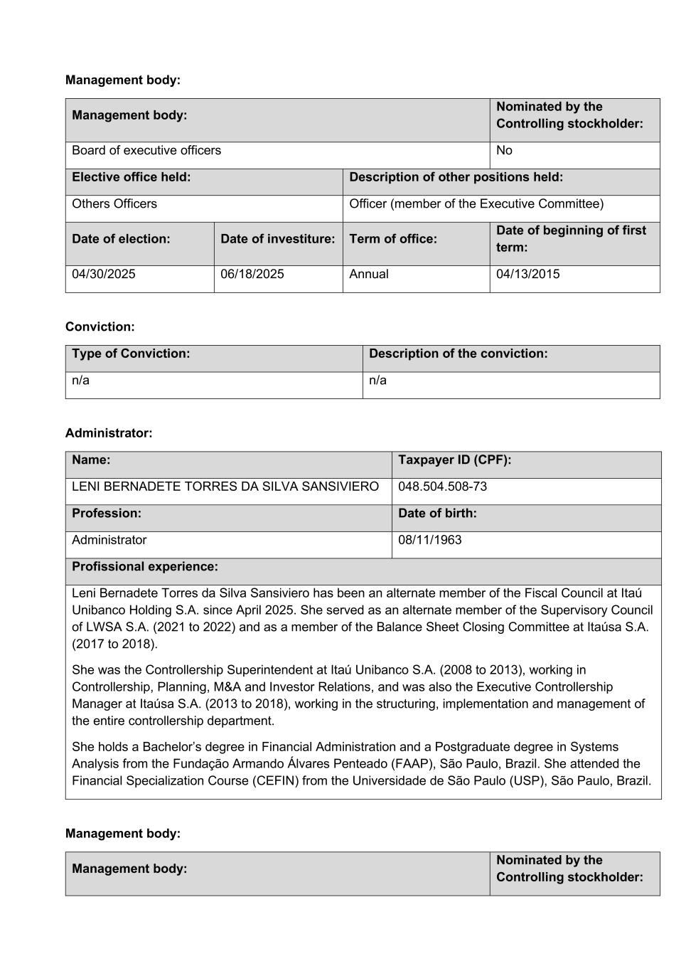 Management body: Management body: Nominated by the Controlling stockholder: Board of executive officers No Elective office held: Description of other positions held: Others Officers Officer (member of the Executive Committee) Date of election: Date of investiture: Term of office: Date of beginning of first term: 04/30/2025 06/18/2025 Annual 04/13/2015 Conviction: Type of Conviction: Description of the conviction: n/a n/a Administrator: Name: Taxpayer ID (CPF): LENI BERNADETE TORRES DA SILVA SANSIVIERO 048.504.508-73 Profession: Date of birth: Administrator 08/11/1963 Profissional experience: Leni Bernadete Torres da Silva Sansiviero has been an alternate member of the Fiscal Council at Itaú Unibanco Holding S.A. since April 2025. She served as an alternate member of the Supervisory Council of LWSA S.A. (2021 to 2022) and as a member of the Balance Sheet Closing Committee at Itaúsa S.A. (2017 to 2018). She was the Controllership Superintendent at Itaú Unibanco S.A. (2008 to 2013), working in Controllership, Planning, M&A and Investor Relations, and was also the Executive Controllership Manager at Itaúsa S.A. (2013 to 2018), working in the structuring, implementation and management of the entire controllership department. She holds a Bachelor’s degree in Financial Administration and a Postgraduate degree in Systems Analysis from the Fundação Armando Álvares Penteado (FAAP), São Paulo, Brazil. She attended the Financial Specialization Course (CEFIN) from the Universidade de São Paulo (USP), São Paulo, Brazil. Management body: Management body: Nominated by the Controlling stockholder: