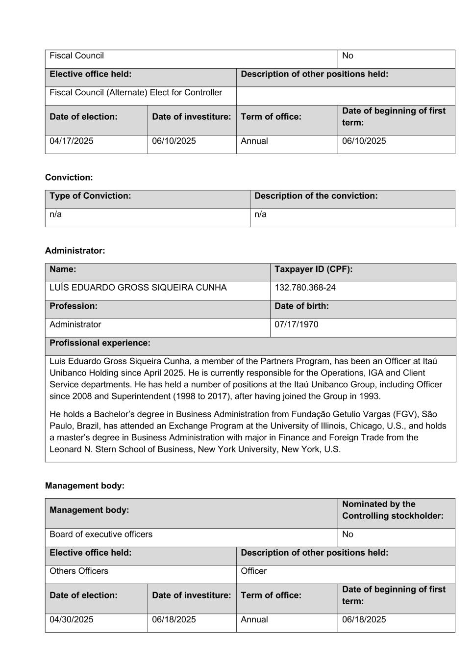 Fiscal Council No Elective office held: Description of other positions held: Fiscal Council (Alternate) Elect for Controller Date of election: Date of investiture: Term of office: Date of beginning of first term: 04/17/2025 06/10/2025 Annual 06/10/2025 Conviction: Type of Conviction: Description of the conviction: n/a n/a Administrator: Name: Taxpayer ID (CPF): LUÍS EDUARDO GROSS SIQUEIRA CUNHA 132.780.368-24 Profession: Date of birth: Administrator 07/17/1970 Profissional experience: Luis Eduardo Gross Siqueira Cunha, a member of the Partners Program, has been an Officer at Itaú Unibanco Holding since April 2025. He is currently responsible for the Operations, IGA and Client Service departments. He has held a number of positions at the Itaú Unibanco Group, including Officer since 2008 and Superintendent (1998 to 2017), after having joined the Group in 1993. He holds a Bachelor’s degree in Business Administration from Fundação Getulio Vargas (FGV), São Paulo, Brazil, has attended an Exchange Program at the University of Illinois, Chicago, U.S., and holds a master’s degree in Business Administration with major in Finance and Foreign Trade from the Leonard N. Stern School of Business, New York University, New York, U.S. Management body: Management body: Nominated by the Controlling stockholder: Board of executive officers No Elective office held: Description of other positions held: Others Officers Officer Date of election: Date of investiture: Term of office: Date of beginning of first term: 04/30/2025 06/18/2025 Annual 06/18/2025