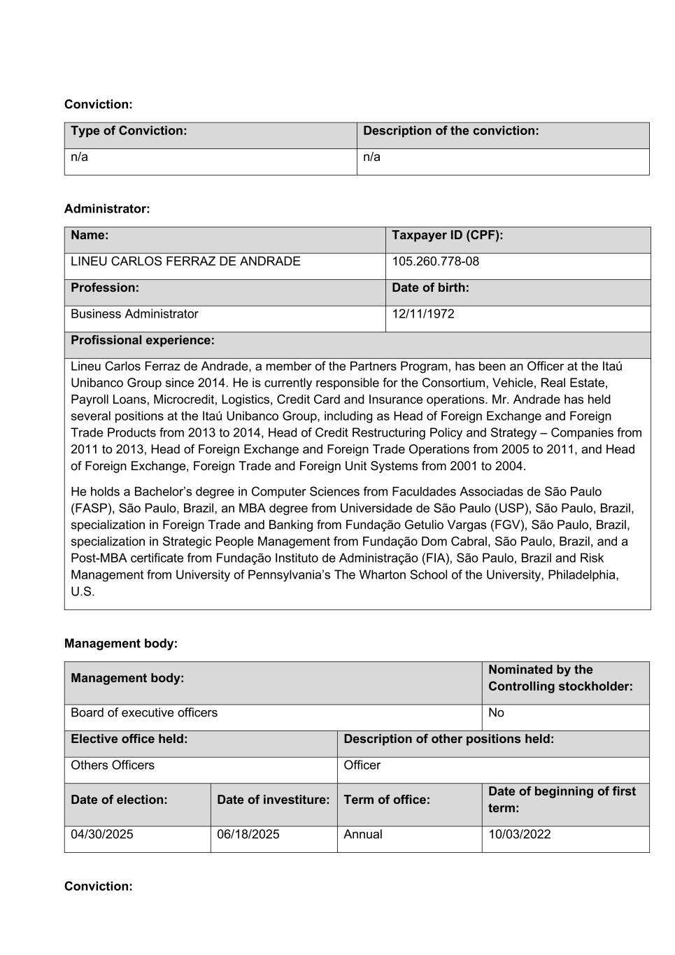 Conviction: Type of Conviction: Description of the conviction: n/a n/a Administrator: Name: Taxpayer ID (CPF): LINEU CARLOS FERRAZ DE ANDRADE 105.260.778-08 Profession: Date of birth: Business Administrator 12/11/1972 Profissional experience: Lineu Carlos Ferraz de Andrade, a member of the Partners Program, has been an Officer at the Itaú Unibanco Group since 2014. He is currently responsible for the Consortium, Vehicle, Real Estate, Payroll Loans, Microcredit, Logistics, Credit Card and Insurance operations. Mr. Andrade has held several positions at the Itaú Unibanco Group, including as Head of Foreign Exchange and Foreign Trade Products from 2013 to 2014, Head of Credit Restructuring Policy and Strategy – Companies from 2011 to 2013, Head of Foreign Exchange and Foreign Trade Operations from 2005 to 2011, and Head of Foreign Exchange, Foreign Trade and Foreign Unit Systems from 2001 to 2004. He holds a Bachelor’s degree in Computer Sciences from Faculdades Associadas de São Paulo (FASP), São Paulo, Brazil, an MBA degree from Universidade de São Paulo (USP), São Paulo, Brazil, specialization in Foreign Trade and Banking from Fundação Getulio Vargas (FGV), São Paulo, Brazil, specialization in Strategic People Management from Fundação Dom Cabral, São Paulo, Brazil, and a Post-MBA certificate from Fundação Instituto de Administração (FIA), São Paulo, Brazil and Risk Management from University of Pennsylvania’s The Wharton School of the University, Philadelphia, U.S. Management body: Management body: Nominated by the Controlling stockholder: Board of executive officers No Elective office held: Description of other positions held: Others Officers Officer Date of election: Date of investiture: Term of office: Date of beginning of first term: 04/30/2025 06/18/2025 Annual 10/03/2022 Conviction: