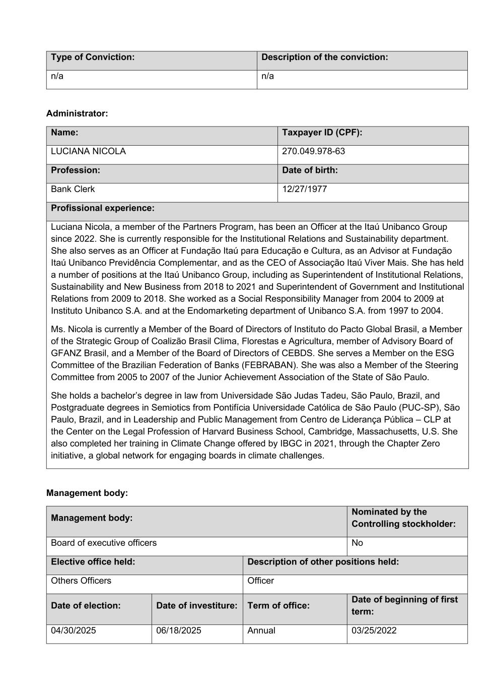 Type of Conviction: Description of the conviction: n/a n/a Administrator: Name: Taxpayer ID (CPF): LUCIANA NICOLA 270.049.978-63 Profession: Date of birth: Bank Clerk 12/27/1977 Profissional experience: Luciana Nicola, a member of the Partners Program, has been an Officer at the Itaú Unibanco Group since 2022. She is currently responsible for the Institutional Relations and Sustainability department. She also serves as an Officer at Fundação Itaú para Educação e Cultura, as an Advisor at Fundação Itaú Unibanco Previdência Complementar, and as the CEO of Associação Itaú Viver Mais. She has held a number of positions at the Itaú Unibanco Group, including as Superintendent of Institutional Relations, Sustainability and New Business from 2018 to 2021 and Superintendent of Government and Institutional Relations from 2009 to 2018. She worked as a Social Responsibility Manager from 2004 to 2009 at Instituto Unibanco S.A. and at the Endomarketing department of Unibanco S.A. from 1997 to 2004. Ms. Nicola is currently a Member of the Board of Directors of Instituto do Pacto Global Brasil, a Member of the Strategic Group of Coalizão Brasil Clima, Florestas e Agricultura, member of Advisory Board of GFANZ Brasil, and a Member of the Board of Directors of CEBDS. She serves a Member on the ESG Committee of the Brazilian Federation of Banks (FEBRABAN). She was also a Member of the Steering Committee from 2005 to 2007 of the Junior Achievement Association of the State of São Paulo. She holds a bachelor’s degree in law from Universidade São Judas Tadeu, São Paulo, Brazil, and Postgraduate degrees in Semiotics from Pontifícia Universidade Católica de São Paulo (PUC-SP), São Paulo, Brazil, and in Leadership and Public Management from Centro de Liderança Pública – CLP at the Center on the Legal Profession of Harvard Business School, Cambridge, Massachusetts, U.S. She also completed her training in Climate Change offered by IBGC in 2021, through the Chapter Zero initiative, a global network for engaging boards in climate challenges. Management body: Management body: Nominated by the Controlling stockholder: Board of executive officers No Elective office held: Description of other positions held: Others Officers Officer Date of election: Date of investiture: Term of office: Date of beginning of first term: 04/30/2025 06/18/2025 Annual 03/25/2022