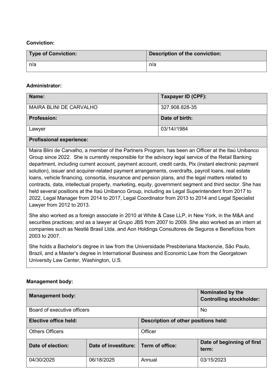 Conviction: Type of Conviction: Description of the conviction: n/a n/a Administrator: Name: Taxpayer ID (CPF): MAIRA BLINI DE CARVALHO 327.908.828-35 Profession: Date of birth: Lawyer 03/14//1984 Profissional experience: Maira Blini de Carvalho, a member of the Partners Program, has been an Officer at the Itaú Unibanco Group since 2022. She is currently responsible for the advisory legal service of the Retail Banking department, including current account, payment account, credit cards, Pix (instant electronic payment solution), issuer and acquirer-related payment arrangements, overdrafts, payroll loans, real estate loans, vehicle financing, consortia, insurance and pension plans, and the legal matters related to contracts, data, intellectual property, marketing, equity, government segment and third sector. She has held several positions at the Itaú Unibanco Group, including as Legal Superintendent from 2017 to 2022, Legal Manager from 2014 to 2017, Legal Coordinator from 2013 to 2014 and Legal Specialist Lawyer from 2012 to 2013. She also worked as a foreign associate in 2010 at White & Case LLP, in New York, in the M&A and securities practices; and as a lawyer at Grupo JBS from 2007 to 2009. She also worked as an intern at companies such as Nestlé Brasil Ltda. and Aon Holdings Consultores de Seguros e Benefícios from 2003 to 2007. She holds a Bachelor’s degree in law from the Universidade Presbiteriana Mackenzie, São Paulo, Brazil, and a Master’s degree in International Business and Economic Law from the Georgetown University Law Center, Washington, U.S. Management body: Management body: Nominated by the Controlling stockholder: Board of executive officers No Elective office held: Description of other positions held: Others Officers Officer Date of election: Date of investiture: Term of office: Date of beginning of first term: 04/30/2025 06/18/2025 Annual 03/15/2023
