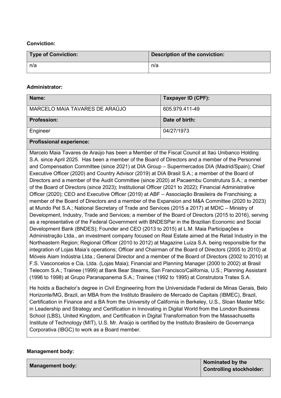 Conviction: Type of Conviction: Description of the conviction: n/a n/a Administrator: Name: Taxpayer ID (CPF): MARCELO MAIA TAVARES DE ARAÚJO 605.979.411-49 Profession: Date of birth: Engineer 04/27/1973 Profissional experience: Marcelo Maia Tavares de Araújo has been a Member of the Fiscal Council at Itaú Unibanco Holding S.A. since April 2025. Has been a member of the Board of Directors and a member of the Personnel and Compensation Committee (since 2021) at DIA Group – Supermercados DIA (Madrid/Spain); Chief Executive Officer (2020) and Country Advisor (2019) at DIA Brasil S.A.; a member of the Board of Directors and a member of the Audit Committee (since 2020) at Pacaembu Construtura S.A.; a member of the Board of Directors (since 2023); Institutional Officer (2021 to 2022); Financial Administrative Officer (2020); CEO and Executive Officer (2019) at ABF – Associação Brasileira de Franchising; a member of the Board of Directors and a member of the Expansion and M&A Committee (2020 to 2023) at Mundo Pet S.A.; National Secretary of Trade and Services (2015 a 2017) at MDIC – Ministry of Development, Industry, Trade and Services; a member of the Board of Directors (2015 to 2016), serving as a representative of the Federal Government with BNDESPar in the Brazilian Economic and Social Development Bank (BNDES); Founder and CEO (2013 to 2015) at L.M. Maia Participações e Administração Ltda., an investment company focused on Real Estate aimed at the Retail Industry in the Northeastern Region; Regional Officer (2010 to 2012) at Magazine Luiza S.A. being responsible for the integration of Lojas Maia’s operations; Officer and Chairman of the Board of Directors (2005 to 2010) at Móveis Aiam Indústria Ltda.; General Director and a member of the Board of Directors (2002 to 2010) at F.S. Vasconcelos e Cia. Ltda. (Lojas Maia); Financial and Planning Manager (2000 to 2002) at Brasil Telecom S.A.; Trainee (1999) at Bank Bear Stearns, San Francisco/California, U.S.; Planning Assistant (1996 to 1998) at Grupo Paranapanema S.A.; Trainee (1992 to 1995) at Construtora Tratex S.A. He holds a Bachelor’s degree in Civil Engineering from the Universidade Federal de Minas Gerais, Belo Horizonte/MG, Brazil, an MBA from the Instituto Brasileiro de Mercado de Capitais (IBMEC), Brazil, Certification in Finance and a BA from the University of California in Berkeley, U.S., Sloan Master MSc in Leadership and Strategy and Certification in Innovating in Digital World from the London Business School (LBS), United Kingdom, and Certification in Digital Transformation from the Massachusetts Institute of Technology (MIT), U.S. Mr. Araújo is certified by the Instituto Brasileiro de Governança Corporativa (IBGC) to work as a Board member. Management body: Management body: Nominated by the Controlling stockholder: