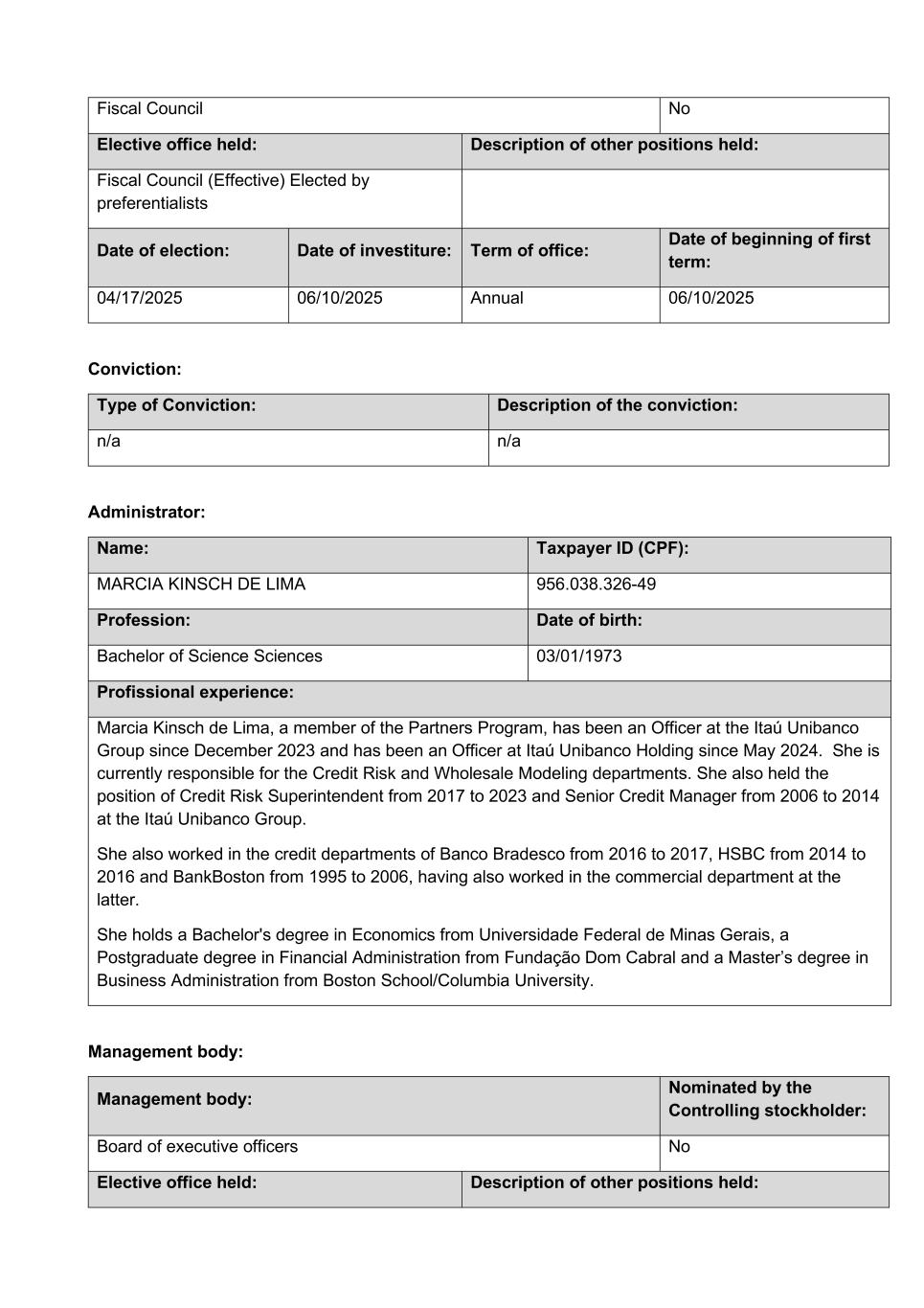 Fiscal Council No Elective office held: Description of other positions held: Fiscal Council (Effective) Elected by preferentialists Date of election: Date of investiture: Term of office: Date of beginning of first term: 04/17/2025 06/10/2025 Annual 06/10/2025 Conviction: Type of Conviction: Description of the conviction: n/a n/a Administrator: Name: Taxpayer ID (CPF): MARCIA KINSCH DE LIMA 956.038.326-49 Profession: Date of birth: Bachelor of Science Sciences 03/01/1973 Profissional experience: Marcia Kinsch de Lima, a member of the Partners Program, has been an Officer at the Itaú Unibanco Group since December 2023 and has been an Officer at Itaú Unibanco Holding since May 2024. She is currently responsible for the Credit Risk and Wholesale Modeling departments. She also held the position of Credit Risk Superintendent from 2017 to 2023 and Senior Credit Manager from 2006 to 2014 at the Itaú Unibanco Group. She also worked in the credit departments of Banco Bradesco from 2016 to 2017, HSBC from 2014 to 2016 and BankBoston from 1995 to 2006, having also worked in the commercial department at the latter. She holds a Bachelor's degree in Economics from Universidade Federal de Minas Gerais, a Postgraduate degree in Financial Administration from Fundação Dom Cabral and a Master’s degree in Business Administration from Boston School/Columbia University. Management body: Management body: Nominated by the Controlling stockholder: Board of executive officers No Elective office held: Description of other positions held: