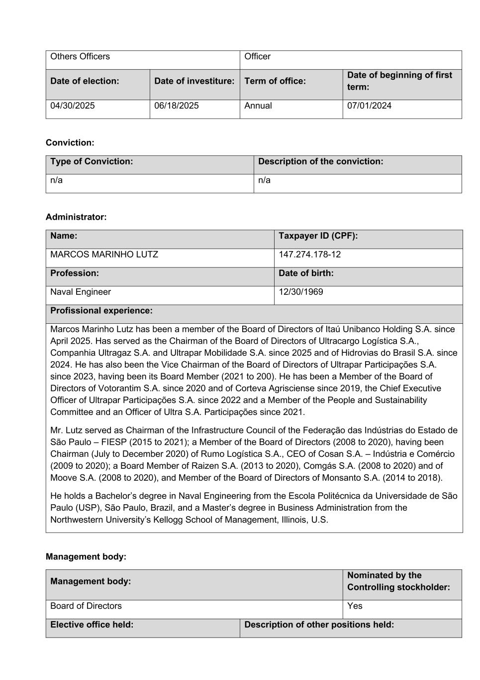 Others Officers Officer Date of election: Date of investiture: Term of office: Date of beginning of first term: 04/30/2025 06/18/2025 Annual 07/01/2024 Conviction: Type of Conviction: Description of the conviction: n/a n/a Administrator: Name: Taxpayer ID (CPF): MARCOS MARINHO LUTZ 147.274.178-12 Profession: Date of birth: Naval Engineer 12/30/1969 Profissional experience: Marcos Marinho Lutz has been a member of the Board of Directors of Itaú Unibanco Holding S.A. since April 2025. Has served as the Chairman of the Board of Directors of Ultracargo Logística S.A., Companhia Ultragaz S.A. and Ultrapar Mobilidade S.A. since 2025 and of Hidrovias do Brasil S.A. since 2024. He has also been the Vice Chairman of the Board of Directors of Ultrapar Participações S.A. since 2023, having been its Board Member (2021 to 200). He has been a Member of the Board of Directors of Votorantim S.A. since 2020 and of Corteva Agrisciense since 2019, the Chief Executive Officer of Ultrapar Participações S.A. since 2022 and a Member of the People and Sustainability Committee and an Officer of Ultra S.A. Participações since 2021. Mr. Lutz served as Chairman of the Infrastructure Council of the Federação das Indústrias do Estado de São Paulo – FIESP (2015 to 2021); a Member of the Board of Directors (2008 to 2020), having been Chairman (July to December 2020) of Rumo Logística S.A., CEO of Cosan S.A. – Indústria e Comércio (2009 to 2020); a Board Member of Raizen S.A. (2013 to 2020), Comgás S.A. (2008 to 2020) and of Moove S.A. (2008 to 2020), and Member of the Board of Directors of Monsanto S.A. (2014 to 2018). He holds a Bachelor’s degree in Naval Engineering from the Escola Politécnica da Universidade de São Paulo (USP), São Paulo, Brazil, and a Master’s degree in Business Administration from the Northwestern University’s Kellogg School of Management, Illinois, U.S. Management body: Management body: Nominated by the Controlling stockholder: Board of Directors Yes Elective office held: Description of other positions held: