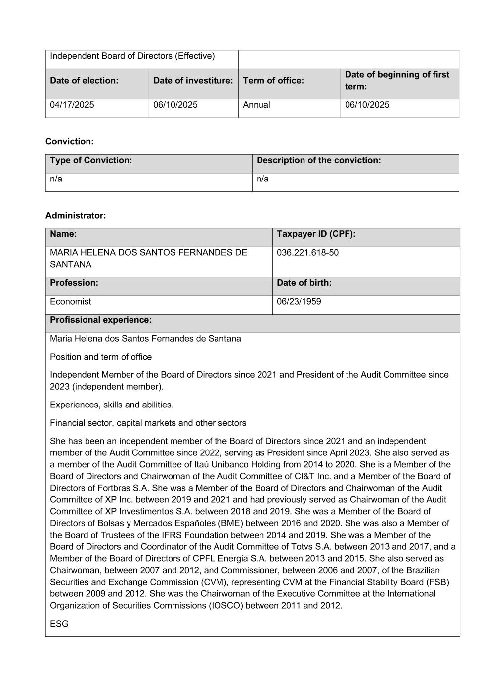 Independent Board of Directors (Effective) Date of election: Date of investiture: Term of office: Date of beginning of first term: 04/17/2025 06/10/2025 Annual 06/10/2025 Conviction: Type of Conviction: Description of the conviction: n/a n/a Administrator: Name: Taxpayer ID (CPF): MARIA HELENA DOS SANTOS FERNANDES DE SANTANA 036.221.618-50 Profession: Date of birth: Economist 06/23/1959 Profissional experience: Maria Helena dos Santos Fernandes de Santana Position and term of office Independent Member of the Board of Directors since 2021 and President of the Audit Committee since 2023 (independent member). Experiences, skills and abilities. Financial sector, capital markets and other sectors She has been an independent member of the Board of Directors since 2021 and an independent member of the Audit Committee since 2022, serving as President since April 2023. She also served as a member of the Audit Committee of Itaú Unibanco Holding from 2014 to 2020. She is a Member of the Board of Directors and Chairwoman of the Audit Committee of CI&T Inc. and a Member of the Board of Directors of Fortbras S.A. She was a Member of the Board of Directors and Chairwoman of the Audit Committee of XP Inc. between 2019 and 2021 and had previously served as Chairwoman of the Audit Committee of XP Investimentos S.A. between 2018 and 2019. She was a Member of the Board of Directors of Bolsas y Mercados Españoles (BME) between 2016 and 2020. She was also a Member of the Board of Trustees of the IFRS Foundation between 2014 and 2019. She was a Member of the Board of Directors and Coordinator of the Audit Committee of Totvs S.A. between 2013 and 2017, and a Member of the Board of Directors of CPFL Energia S.A. between 2013 and 2015. She also served as Chairwoman, between 2007 and 2012, and Commissioner, between 2006 and 2007, of the Brazilian Securities and Exchange Commission (CVM), representing CVM at the Financial Stability Board (FSB) between 2009 and 2012. She was the Chairwoman of the Executive Committee at the International Organization of Securities Commissions (IOSCO) between 2011 and 2012. ESG