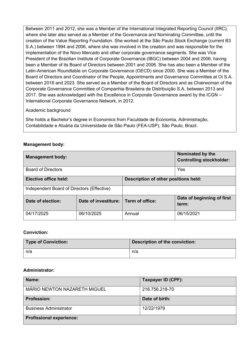 Between 2011 and 2012, she was a Member of the International Integrated Reporting Council (IIRC), where she later also served as a Member of the Governance and Nominating Committee, until the creation of the Value Reporting Foundation. She worked at the São Paulo Stock Exchange (current B3 S.A.) between 1994 and 2006, where she was involved in the creation and was responsible for the implementation of the Novo Mercado and other corporate governance segments. She was Vice President of the Brazilian Institute of Corporate Governance (IBGC) between 2004 and 2006, having been a Member of its Board of Directors between 2001 and 2006. She has also been a Member of the Latin-American Roundtable on Corporate Governance (OECD) since 2000. She was a Member of the Board of Directors and Coordinator of the People, Appointments and Governance Committee at Oi S.A. between 2018 and 2023. She served as a Member of the Board of Directors and as Chairwoman of the Corporate Governance Committee of Companhia Brasileira de Distribuição S.A. between 2013 and 2017. She was acknowledged with the Excellence in Corporate Governance award by the ICGN – International Corporate Governance Network, in 2012. Academic background She holds a Bachelor’s degree in Economics from Faculdade de Economia, Administração, Contabilidade e Atuária da Universidade de São Paulo (FEA-USP), São Paulo, Brazil. Management body: Management body: Nominated by the Controlling stockholder: Board of Directors Yes Elective office held: Description of other positions held: Independent Board of Directors (Effective) Date of election: Date of investiture: Term of office: Date of beginning of first term: 04/17/2025 06/10/2025 Annual 06/15/2021 Conviction: Type of Conviction: Description of the conviction: n/a n/a Administrator: Name: Taxpayer ID (CPF): MÁRIO NEWTON NAZARETH MIGUEL 216.756.218-70 Profession: Date of birth: Business Administrator 12/22/1979 Profissional experience: