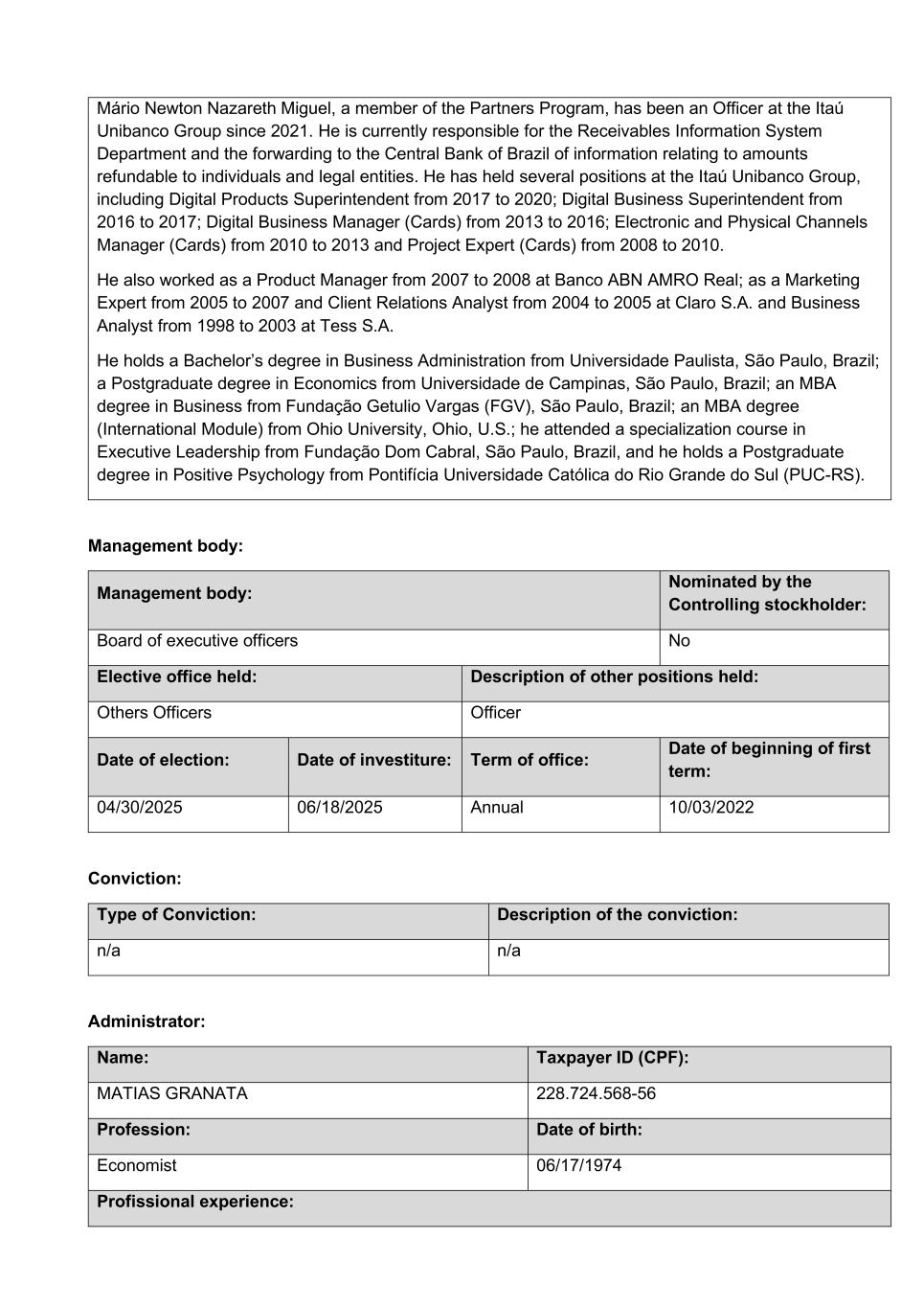 Mário Newton Nazareth Miguel, a member of the Partners Program, has been an Officer at the Itaú Unibanco Group since 2021. He is currently responsible for the Receivables Information System Department and the forwarding to the Central Bank of Brazil of information relating to amounts refundable to individuals and legal entities. He has held several positions at the Itaú Unibanco Group, including Digital Products Superintendent from 2017 to 2020; Digital Business Superintendent from 2016 to 2017; Digital Business Manager (Cards) from 2013 to 2016; Electronic and Physical Channels Manager (Cards) from 2010 to 2013 and Project Expert (Cards) from 2008 to 2010. He also worked as a Product Manager from 2007 to 2008 at Banco ABN AMRO Real; as a Marketing Expert from 2005 to 2007 and Client Relations Analyst from 2004 to 2005 at Claro S.A. and Business Analyst from 1998 to 2003 at Tess S.A. He holds a Bachelor’s degree in Business Administration from Universidade Paulista, São Paulo, Brazil; a Postgraduate degree in Economics from Universidade de Campinas, São Paulo, Brazil; an MBA degree in Business from Fundação Getulio Vargas (FGV), São Paulo, Brazil; an MBA degree (International Module) from Ohio University, Ohio, U.S.; he attended a specialization course in Executive Leadership from Fundação Dom Cabral, São Paulo, Brazil, and he holds a Postgraduate degree in Positive Psychology from Pontifícia Universidade Católica do Rio Grande do Sul (PUC-RS). Management body: Management body: Nominated by the Controlling stockholder: Board of executive officers No Elective office held: Description of other positions held: Others Officers Officer Date of election: Date of investiture: Term of office: Date of beginning of first term: 04/30/2025 06/18/2025 Annual 10/03/2022 Conviction: Type of Conviction: Description of the conviction: n/a n/a Administrator: Name: Taxpayer ID (CPF): MATIAS GRANATA 228.724.568-56 Profession: Date of birth: Economist 06/17/1974 Profissional experience: