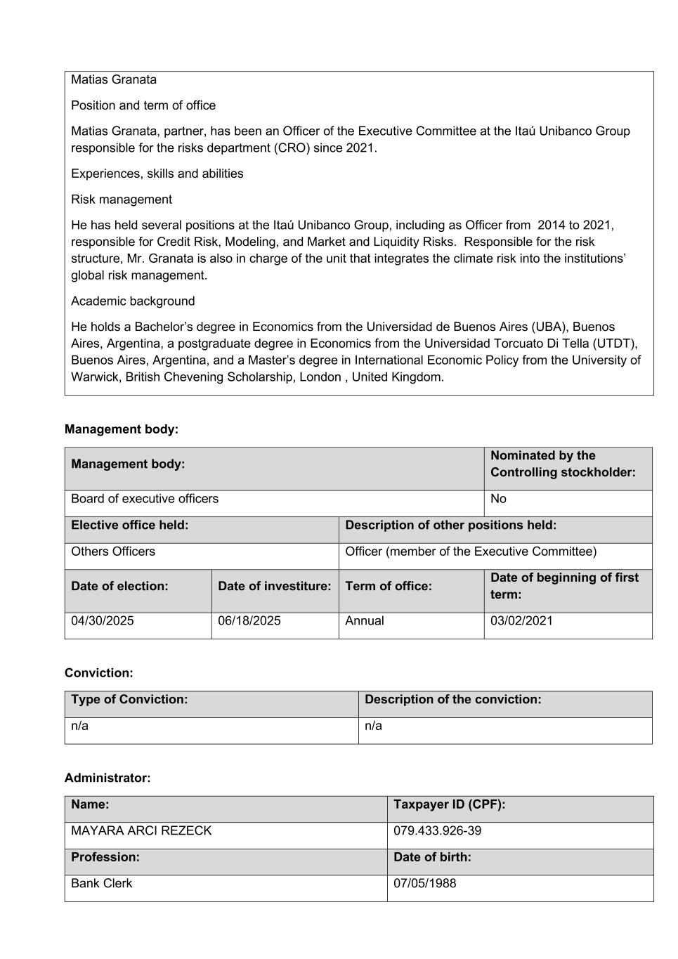 Matias Granata Position and term of office Matias Granata, partner, has been an Officer of the Executive Committee at the Itaú Unibanco Group responsible for the risks department (CRO) since 2021. Experiences, skills and abilities Risk management He has held several positions at the Itaú Unibanco Group, including as Officer from 2014 to 2021, responsible for Credit Risk, Modeling, and Market and Liquidity Risks. Responsible for the risk structure, Mr. Granata is also in charge of the unit that integrates the climate risk into the institutions’ global risk management. Academic background He holds a Bachelor’s degree in Economics from the Universidad de Buenos Aires (UBA), Buenos Aires, Argentina, a postgraduate degree in Economics from the Universidad Torcuato Di Tella (UTDT), Buenos Aires, Argentina, and a Master’s degree in International Economic Policy from the University of Warwick, British Chevening Scholarship, London , United Kingdom. Management body: Management body: Nominated by the Controlling stockholder: Board of executive officers No Elective office held: Description of other positions held: Others Officers Officer (member of the Executive Committee) Date of election: Date of investiture: Term of office: Date of beginning of first term: 04/30/2025 06/18/2025 Annual 03/02/2021 Conviction: Type of Conviction: Description of the conviction: n/a n/a Administrator: Name: Taxpayer ID (CPF): MAYARA ARCI REZECK 079.433.926-39 Profession: Date of birth: Bank Clerk 07/05/1988
