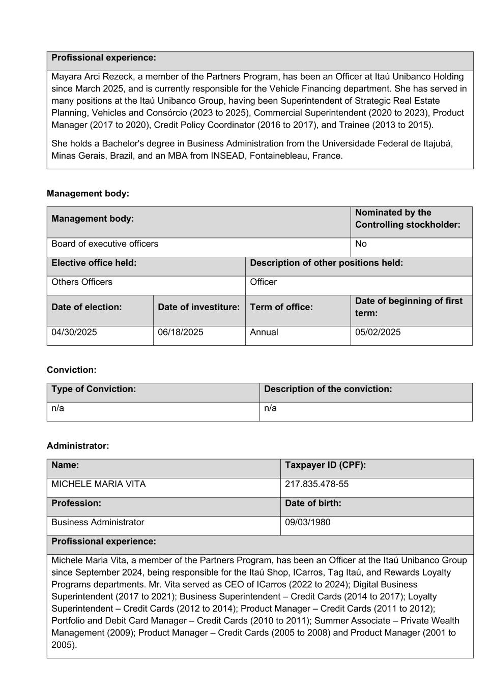 Profissional experience: Mayara Arci Rezeck, a member of the Partners Program, has been an Officer at Itaú Unibanco Holding since March 2025, and is currently responsible for the Vehicle Financing department. She has served in many positions at the Itaú Unibanco Group, having been Superintendent of Strategic Real Estate Planning, Vehicles and Consórcio (2023 to 2025), Commercial Superintendent (2020 to 2023), Product Manager (2017 to 2020), Credit Policy Coordinator (2016 to 2017), and Trainee (2013 to 2015). She holds a Bachelor's degree in Business Administration from the Universidade Federal de Itajubá, Minas Gerais, Brazil, and an MBA from INSEAD, Fontainebleau, France. Management body: Management body: Nominated by the Controlling stockholder: Board of executive officers No Elective office held: Description of other positions held: Others Officers Officer Date of election: Date of investiture: Term of office: Date of beginning of first term: 04/30/2025 06/18/2025 Annual 05/02/2025 Conviction: Type of Conviction: Description of the conviction: n/a n/a Administrator: Name: Taxpayer ID (CPF): MICHELE MARIA VITA 217.835.478-55 Profession: Date of birth: Business Administrator 09/03/1980 Profissional experience: Michele Maria Vita, a member of the Partners Program, has been an Officer at the Itaú Unibanco Group since September 2024, being responsible for the Itaú Shop, ICarros, Tag Itaú, and Rewards Loyalty Programs departments. Mr. Vita served as CEO of ICarros (2022 to 2024); Digital Business Superintendent (2017 to 2021); Business Superintendent – Credit Cards (2014 to 2017); Loyalty Superintendent – Credit Cards (2012 to 2014); Product Manager – Credit Cards (2011 to 2012); Portfolio and Debit Card Manager – Credit Cards (2010 to 2011); Summer Associate – Private Wealth Management (2009); Product Manager – Credit Cards (2005 to 2008) and Product Manager (2001 to 2005).
