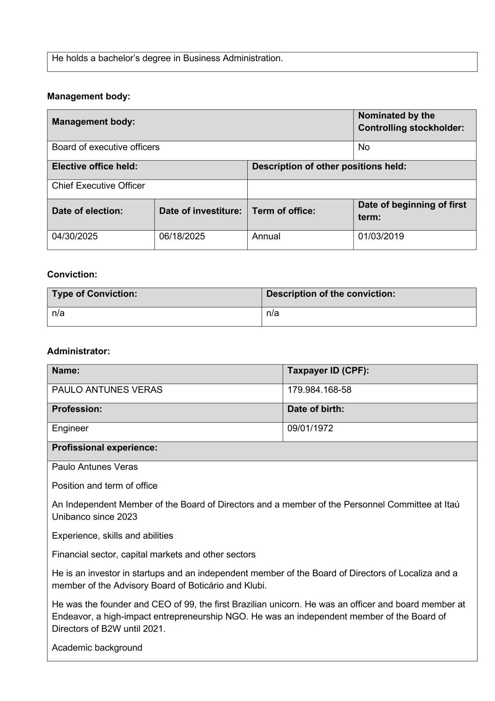 He holds a bachelor’s degree in Business Administration. Management body: Management body: Nominated by the Controlling stockholder: Board of executive officers No Elective office held: Description of other positions held: Chief Executive Officer Date of election: Date of investiture: Term of office: Date of beginning of first term: 04/30/2025 06/18/2025 Annual 01/03/2019 Conviction: Type of Conviction: Description of the conviction: n/a n/a Administrator: Name: Taxpayer ID (CPF): PAULO ANTUNES VERAS 179.984.168-58 Profession: Date of birth: Engineer 09/01/1972 Profissional experience: Paulo Antunes Veras Position and term of office An Independent Member of the Board of Directors and a member of the Personnel Committee at Itaú Unibanco since 2023 Experience, skills and abilities Financial sector, capital markets and other sectors He is an investor in startups and an independent member of the Board of Directors of Localiza and a member of the Advisory Board of Boticário and Klubi. He was the founder and CEO of 99, the first Brazilian unicorn. He was an officer and board member at Endeavor, a high-impact entrepreneurship NGO. He was an independent member of the Board of Directors of B2W until 2021. Academic background
