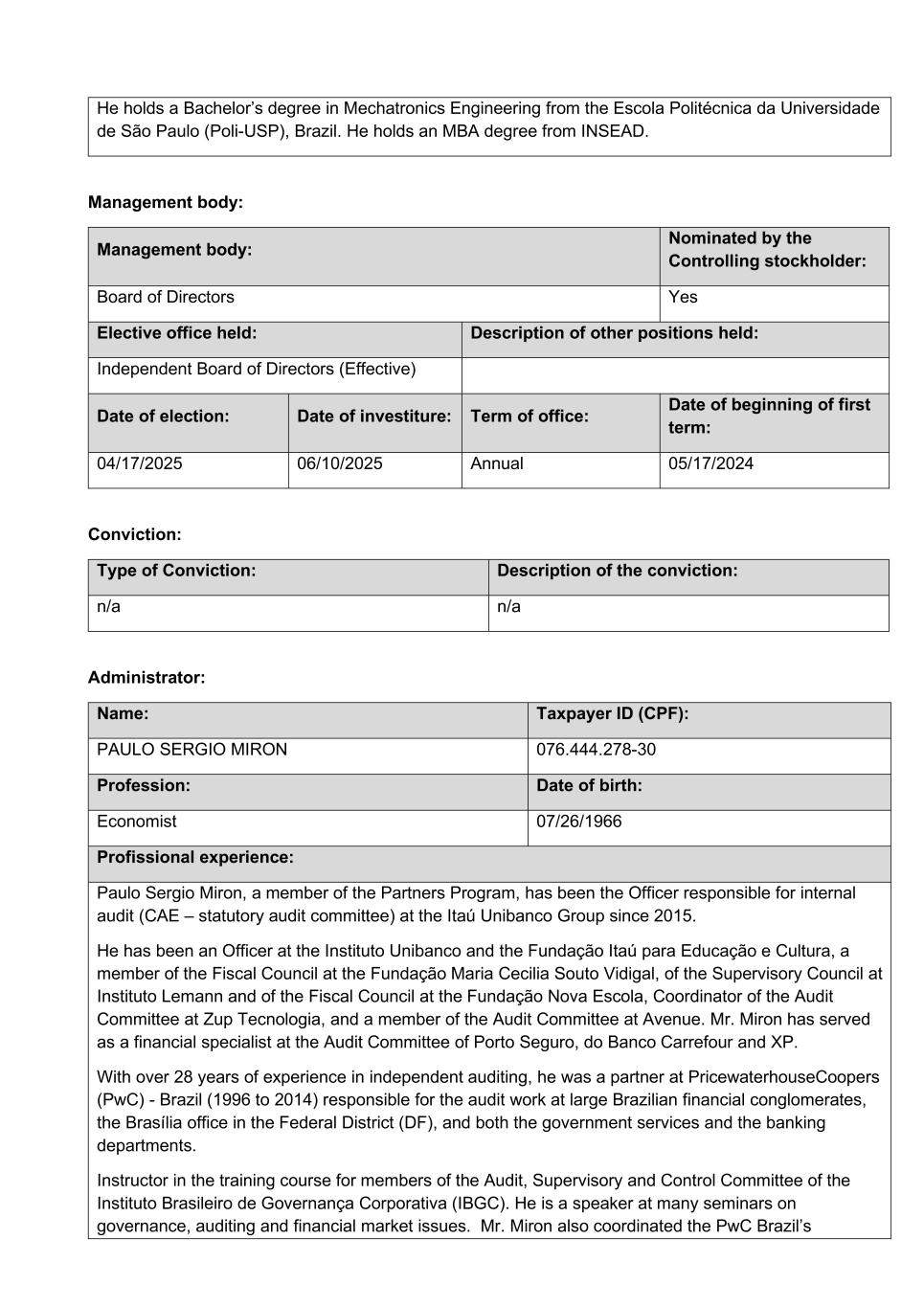 He holds a Bachelor’s degree in Mechatronics Engineering from the Escola Politécnica da Universidade de São Paulo (Poli-USP), Brazil. He holds an MBA degree from INSEAD. Management body: Management body: Nominated by the Controlling stockholder: Board of Directors Yes Elective office held: Description of other positions held: Independent Board of Directors (Effective) Date of election: Date of investiture: Term of office: Date of beginning of first term: 04/17/2025 06/10/2025 Annual 05/17/2024 Conviction: Type of Conviction: Description of the conviction: n/a n/a Administrator: Name: Taxpayer ID (CPF): PAULO SERGIO MIRON 076.444.278-30 Profession: Date of birth: Economist 07/26/1966 Profissional experience: Paulo Sergio Miron, a member of the Partners Program, has been the Officer responsible for internal audit (CAE – statutory audit committee) at the Itaú Unibanco Group since 2015. He has been an Officer at the Instituto Unibanco and the Fundação Itaú para Educação e Cultura, a member of the Fiscal Council at the Fundação Maria Cecilia Souto Vidigal, of the Supervisory Council at Instituto Lemann and of the Fiscal Council at the Fundação Nova Escola, Coordinator of the Audit Committee at Zup Tecnologia, and a member of the Audit Committee at Avenue. Mr. Miron has served as a financial specialist at the Audit Committee of Porto Seguro, do Banco Carrefour and XP. With over 28 years of experience in independent auditing, he was a partner at PricewaterhouseCoopers (PwC) - Brazil (1996 to 2014) responsible for the audit work at large Brazilian financial conglomerates, the Brasília office in the Federal District (DF), and both the government services and the banking departments. Instructor in the training course for members of the Audit, Supervisory and Control Committee of the Instituto Brasileiro de Governança Corporativa (IBGC). He is a speaker at many seminars on governance, auditing and financial market issues. Mr. Miron also coordinated the PwC Brazil’s