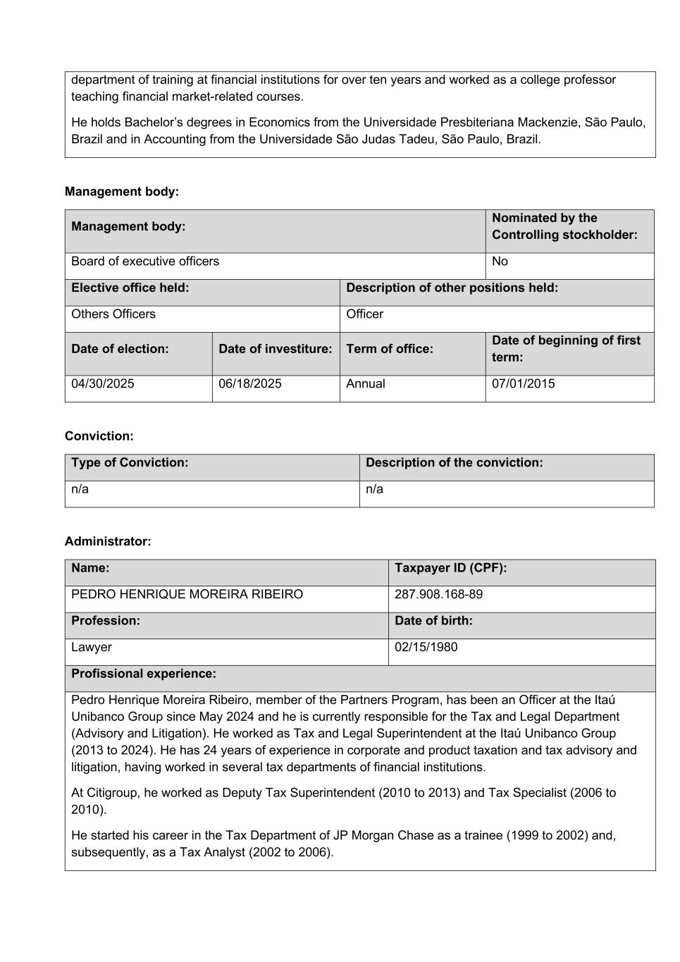 department of training at financial institutions for over ten years and worked as a college professor teaching financial market-related courses. He holds Bachelor’s degrees in Economics from the Universidade Presbiteriana Mackenzie, São Paulo, Brazil and in Accounting from the Universidade São Judas Tadeu, São Paulo, Brazil. Management body: Management body: Nominated by the Controlling stockholder: Board of executive officers No Elective office held: Description of other positions held: Others Officers Officer Date of election: Date of investiture: Term of office: Date of beginning of first term: 04/30/2025 06/18/2025 Annual 07/01/2015 Conviction: Type of Conviction: Description of the conviction: n/a n/a Administrator: Name: Taxpayer ID (CPF): PEDRO HENRIQUE MOREIRA RIBEIRO 287.908.168-89 Profession: Date of birth: Lawyer 02/15/1980 Profissional experience: Pedro Henrique Moreira Ribeiro, member of the Partners Program, has been an Officer at the Itaú Unibanco Group since May 2024 and he is currently responsible for the Tax and Legal Department (Advisory and Litigation). He worked as Tax and Legal Superintendent at the Itaú Unibanco Group (2013 to 2024). He has 24 years of experience in corporate and product taxation and tax advisory and litigation, having worked in several tax departments of financial institutions. At Citigroup, he worked as Deputy Tax Superintendent (2010 to 2013) and Tax Specialist (2006 to 2010). He started his career in the Tax Department of JP Morgan Chase as a trainee (1999 to 2002) and, subsequently, as a Tax Analyst (2002 to 2006).