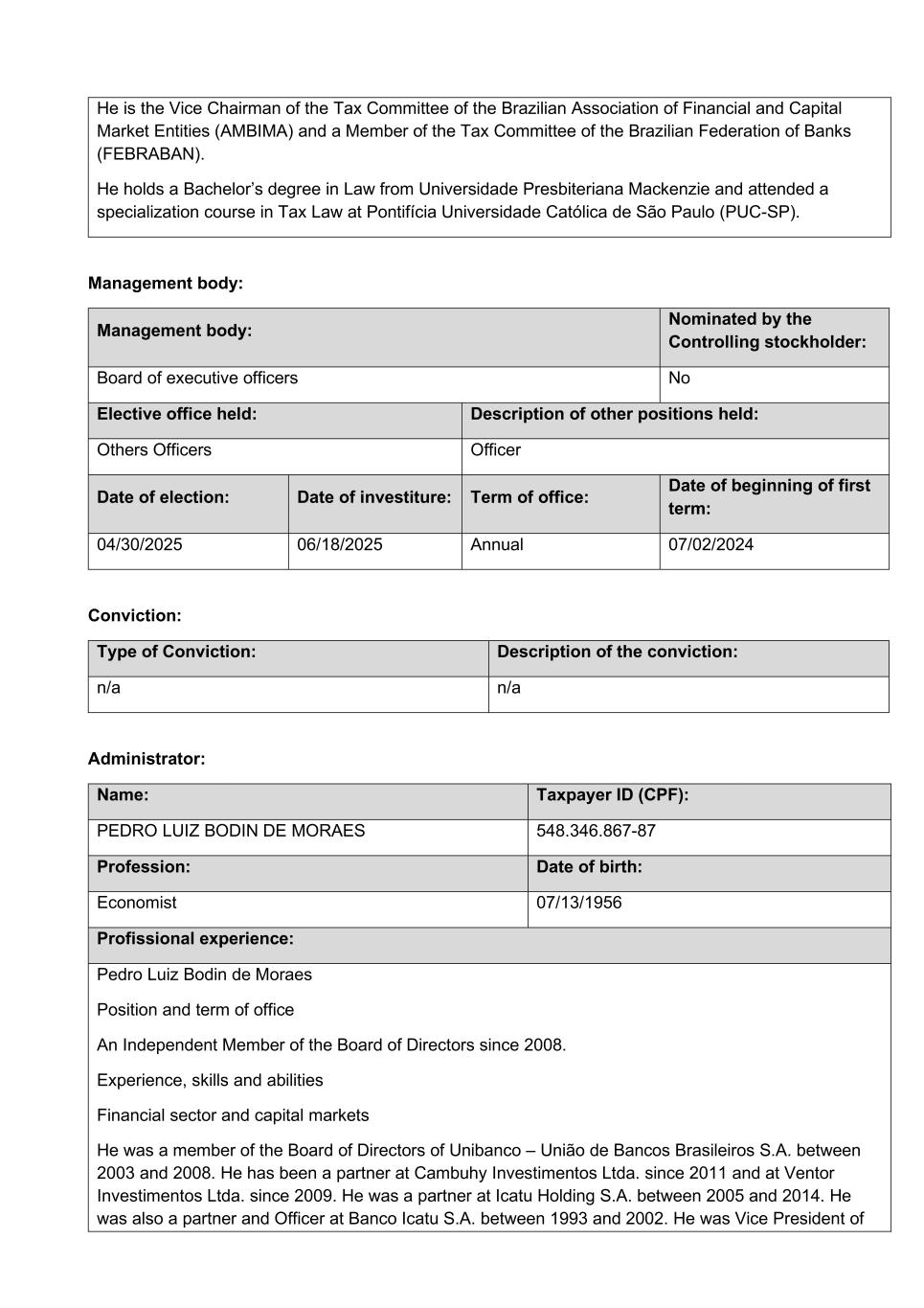 He is the Vice Chairman of the Tax Committee of the Brazilian Association of Financial and Capital Market Entities (AMBIMA) and a Member of the Tax Committee of the Brazilian Federation of Banks (FEBRABAN). He holds a Bachelor’s degree in Law from Universidade Presbiteriana Mackenzie and attended a specialization course in Tax Law at Pontifícia Universidade Católica de São Paulo (PUC-SP). Management body: Management body: Nominated by the Controlling stockholder: Board of executive officers No Elective office held: Description of other positions held: Others Officers Officer Date of election: Date of investiture: Term of office: Date of beginning of first term: 04/30/2025 06/18/2025 Annual 07/02/2024 Conviction: Type of Conviction: Description of the conviction: n/a n/a Administrator: Name: Taxpayer ID (CPF): PEDRO LUIZ BODIN DE MORAES 548.346.867-87 Profession: Date of birth: Economist 07/13/1956 Profissional experience: Pedro Luiz Bodin de Moraes Position and term of office An Independent Member of the Board of Directors since 2008. Experience, skills and abilities Financial sector and capital markets He was a member of the Board of Directors of Unibanco – União de Bancos Brasileiros S.A. between 2003 and 2008. He has been a partner at Cambuhy Investimentos Ltda. since 2011 and at Ventor Investimentos Ltda. since 2009. He was a partner at Icatu Holding S.A. between 2005 and 2014. He was also a partner and Officer at Banco Icatu S.A. between 1993 and 2002. He was Vice President of