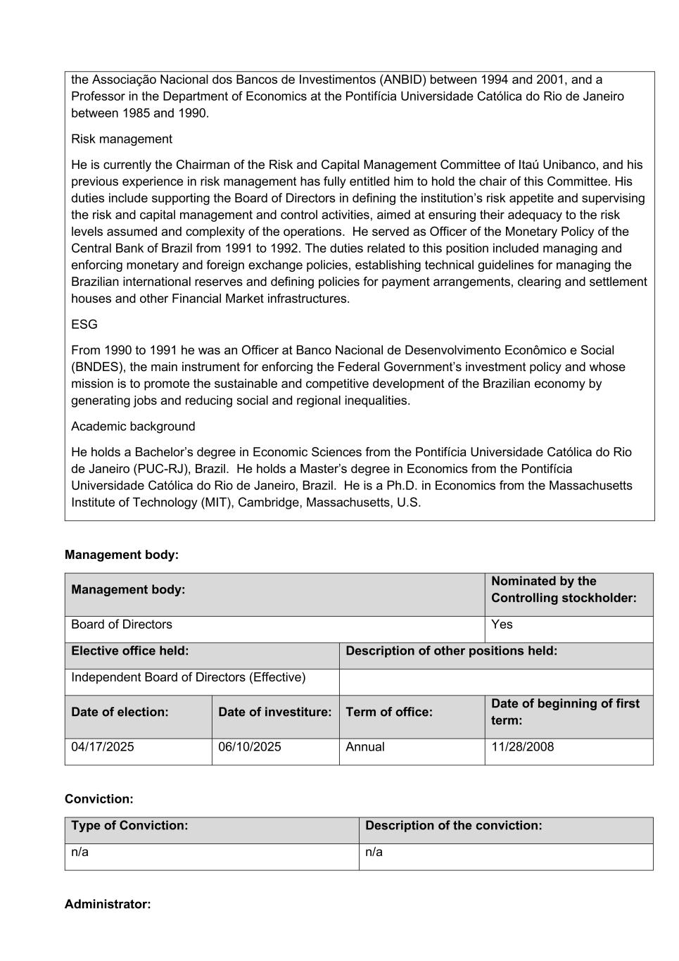 the Associação Nacional dos Bancos de Investimentos (ANBID) between 1994 and 2001, and a Professor in the Department of Economics at the Pontifícia Universidade Católica do Rio de Janeiro between 1985 and 1990. Risk management He is currently the Chairman of the Risk and Capital Management Committee of Itaú Unibanco, and his previous experience in risk management has fully entitled him to hold the chair of this Committee. His duties include supporting the Board of Directors in defining the institution’s risk appetite and supervising the risk and capital management and control activities, aimed at ensuring their adequacy to the risk levels assumed and complexity of the operations. He served as Officer of the Monetary Policy of the Central Bank of Brazil from 1991 to 1992. The duties related to this position included managing and enforcing monetary and foreign exchange policies, establishing technical guidelines for managing the Brazilian international reserves and defining policies for payment arrangements, clearing and settlement houses and other Financial Market infrastructures. ESG From 1990 to 1991 he was an Officer at Banco Nacional de Desenvolvimento Econômico e Social (BNDES), the main instrument for enforcing the Federal Government’s investment policy and whose mission is to promote the sustainable and competitive development of the Brazilian economy by generating jobs and reducing social and regional inequalities. Academic background He holds a Bachelor’s degree in Economic Sciences from the Pontifícia Universidade Católica do Rio de Janeiro (PUC-RJ), Brazil. He holds a Master’s degree in Economics from the Pontifícia Universidade Católica do Rio de Janeiro, Brazil. He is a Ph.D. in Economics from the Massachusetts Institute of Technology (MIT), Cambridge, Massachusetts, U.S. Management body: Management body: Nominated by the Controlling stockholder: Board of Directors Yes Elective office held: Description of other positions held: Independent Board of Directors (Effective) Date of election: Date of investiture: Term of office: Date of beginning of first term: 04/17/2025 06/10/2025 Annual 11/28/2008 Conviction: Type of Conviction: Description of the conviction: n/a n/a Administrator:
