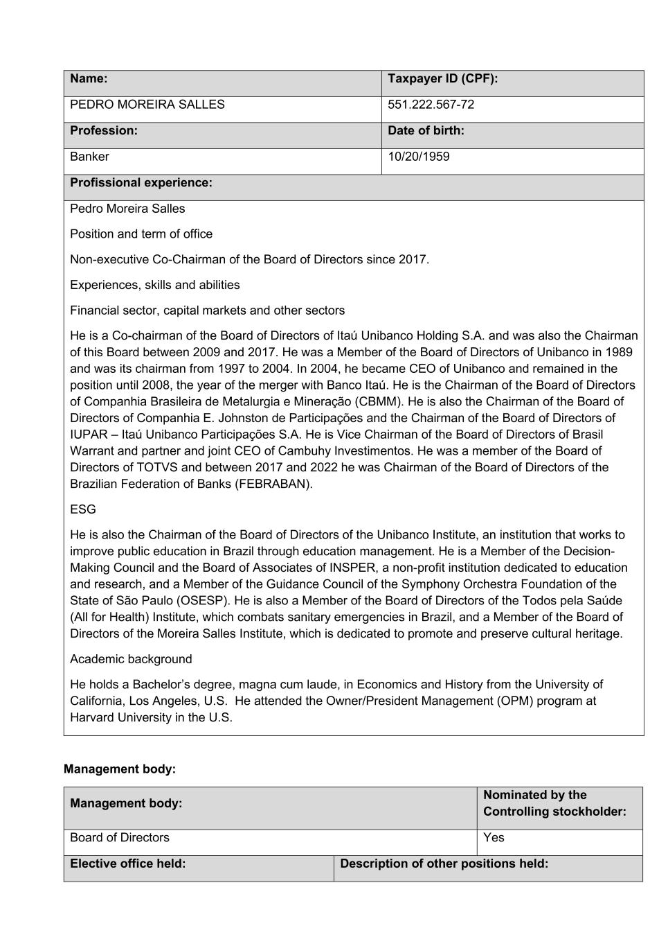 Name: Taxpayer ID (CPF): PEDRO MOREIRA SALLES 551.222.567-72 Profession: Date of birth: Banker 10/20/1959 Profissional experience: Pedro Moreira Salles Position and term of office Non-executive Co-Chairman of the Board of Directors since 2017. Experiences, skills and abilities Financial sector, capital markets and other sectors He is a Co-chairman of the Board of Directors of Itaú Unibanco Holding S.A. and was also the Chairman of this Board between 2009 and 2017. He was a Member of the Board of Directors of Unibanco in 1989 and was its chairman from 1997 to 2004. In 2004, he became CEO of Unibanco and remained in the position until 2008, the year of the merger with Banco Itaú. He is the Chairman of the Board of Directors of Companhia Brasileira de Metalurgia e Mineração (CBMM). He is also the Chairman of the Board of Directors of Companhia E. Johnston de Participações and the Chairman of the Board of Directors of IUPAR – Itaú Unibanco Participações S.A. He is Vice Chairman of the Board of Directors of Brasil Warrant and partner and joint CEO of Cambuhy Investimentos. He was a member of the Board of Directors of TOTVS and between 2017 and 2022 he was Chairman of the Board of Directors of the Brazilian Federation of Banks (FEBRABAN). ESG He is also the Chairman of the Board of Directors of the Unibanco Institute, an institution that works to improve public education in Brazil through education management. He is a Member of the Decision- Making Council and the Board of Associates of INSPER, a non-profit institution dedicated to education and research, and a Member of the Guidance Council of the Symphony Orchestra Foundation of the State of São Paulo (OSESP). He is also a Member of the Board of Directors of the Todos pela Saúde (All for Health) Institute, which combats sanitary emergencies in Brazil, and a Member of the Board of Directors of the Moreira Salles Institute, which is dedicated to promote and preserve cultural heritage. Academic background He holds a Bachelor’s degree, magna cum laude, in Economics and History from the University of California, Los Angeles, U.S. He attended the Owner/President Management (OPM) program at Harvard University in the U.S. Management body: Management body: Nominated by the Controlling stockholder: Board of Directors Yes Elective office held: Description of other positions held: