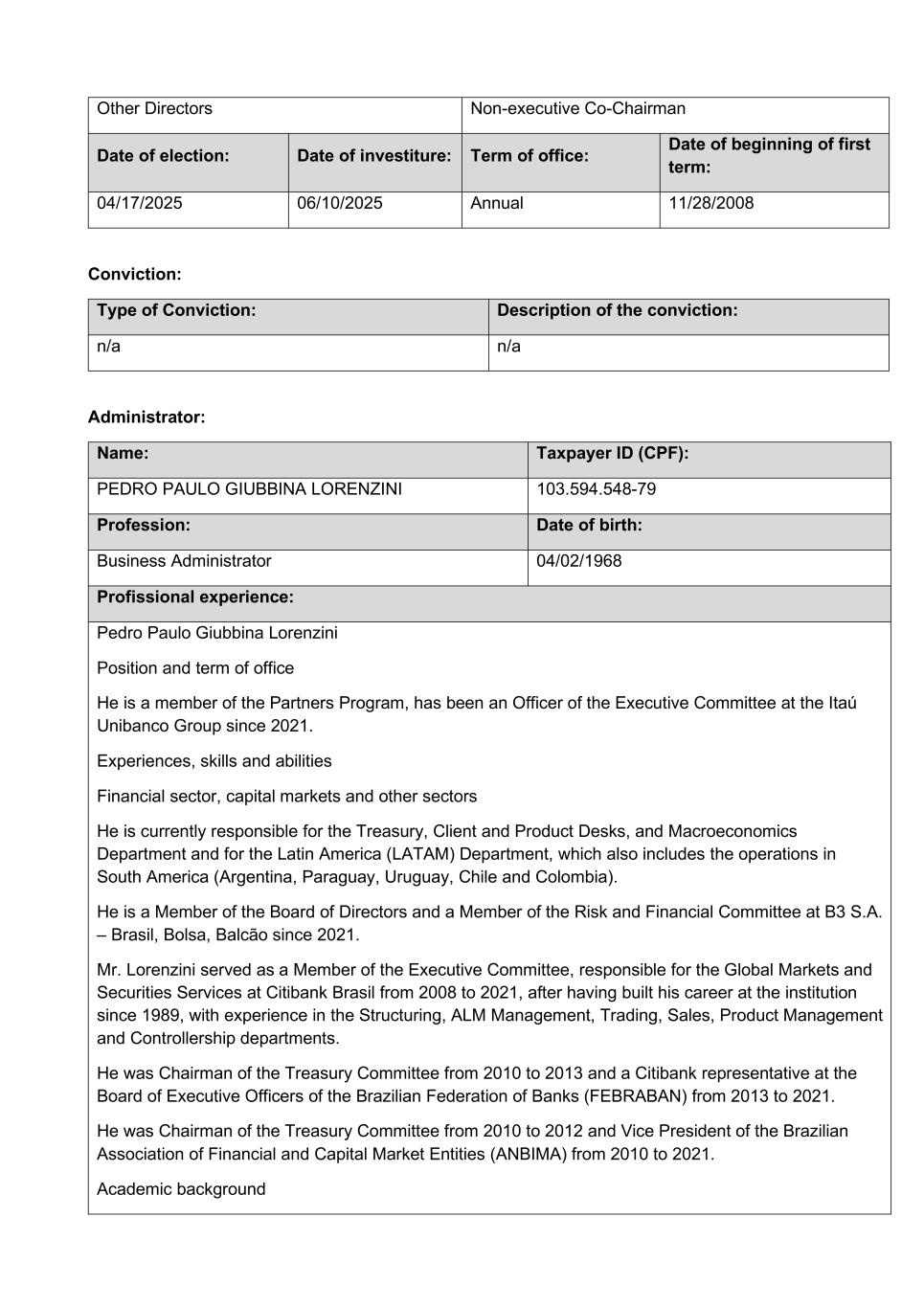 Other Directors Non-executive Co-Chairman Date of election: Date of investiture: Term of office: Date of beginning of first term: 04/17/2025 06/10/2025 Annual 11/28/2008 Conviction: Type of Conviction: Description of the conviction: n/a n/a Administrator: Name: Taxpayer ID (CPF): PEDRO PAULO GIUBBINA LORENZINI 103.594.548-79 Profession: Date of birth: Business Administrator 04/02/1968 Profissional experience: Pedro Paulo Giubbina Lorenzini Position and term of office He is a member of the Partners Program, has been an Officer of the Executive Committee at the Itaú Unibanco Group since 2021. Experiences, skills and abilities Financial sector, capital markets and other sectors He is currently responsible for the Treasury, Client and Product Desks, and Macroeconomics Department and for the Latin America (LATAM) Department, which also includes the operations in South America (Argentina, Paraguay, Uruguay, Chile and Colombia). He is a Member of the Board of Directors and a Member of the Risk and Financial Committee at B3 S.A. – Brasil, Bolsa, Balcão since 2021. Mr. Lorenzini served as a Member of the Executive Committee, responsible for the Global Markets and Securities Services at Citibank Brasil from 2008 to 2021, after having built his career at the institution since 1989, with experience in the Structuring, ALM Management, Trading, Sales, Product Management and Controllership departments. He was Chairman of the Treasury Committee from 2010 to 2013 and a Citibank representative at the Board of Executive Officers of the Brazilian Federation of Banks (FEBRABAN) from 2013 to 2021. He was Chairman of the Treasury Committee from 2010 to 2012 and Vice President of the Brazilian Association of Financial and Capital Market Entities (ANBIMA) from 2010 to 2021. Academic background