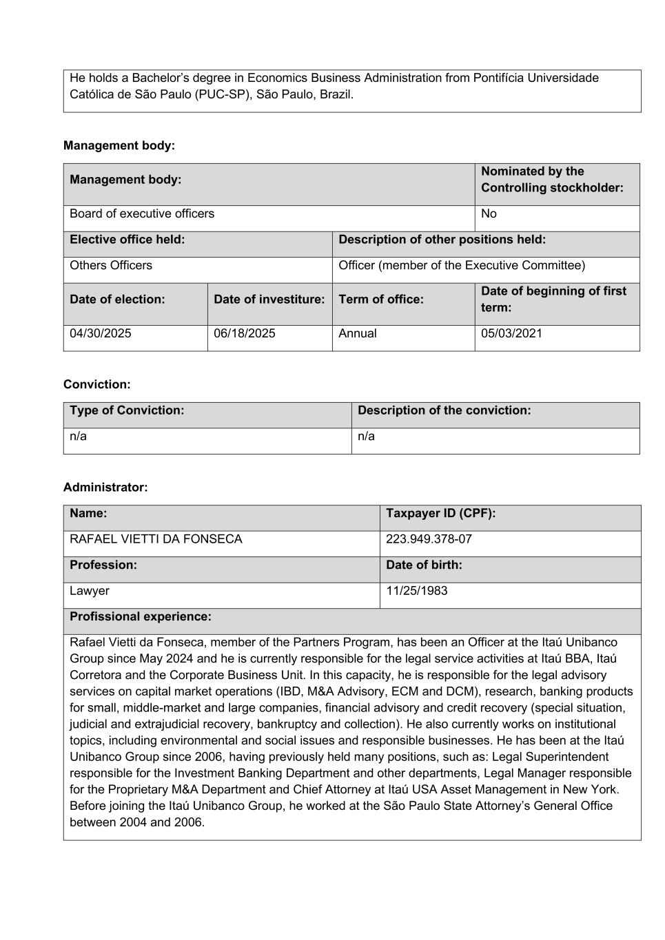 He holds a Bachelor’s degree in Economics Business Administration from Pontifícia Universidade Católica de São Paulo (PUC-SP), São Paulo, Brazil. Management body: Management body: Nominated by the Controlling stockholder: Board of executive officers No Elective office held: Description of other positions held: Others Officers Officer (member of the Executive Committee) Date of election: Date of investiture: Term of office: Date of beginning of first term: 04/30/2025 06/18/2025 Annual 05/03/2021 Conviction: Type of Conviction: Description of the conviction: n/a n/a Administrator: Name: Taxpayer ID (CPF): RAFAEL VIETTI DA FONSECA 223.949.378-07 Profession: Date of birth: Lawyer 11/25/1983 Profissional experience: Rafael Vietti da Fonseca, member of the Partners Program, has been an Officer at the Itaú Unibanco Group since May 2024 and he is currently responsible for the legal service activities at Itaú BBA, Itaú Corretora and the Corporate Business Unit. In this capacity, he is responsible for the legal advisory services on capital market operations (IBD, M&A Advisory, ECM and DCM), research, banking products for small, middle-market and large companies, financial advisory and credit recovery (special situation, judicial and extrajudicial recovery, bankruptcy and collection). He also currently works on institutional topics, including environmental and social issues and responsible businesses. He has been at the Itaú Unibanco Group since 2006, having previously held many positions, such as: Legal Superintendent responsible for the Investment Banking Department and other departments, Legal Manager responsible for the Proprietary M&A Department and Chief Attorney at Itaú USA Asset Management in New York. Before joining the Itaú Unibanco Group, he worked at the São Paulo State Attorney’s General Office between 2004 and 2006.