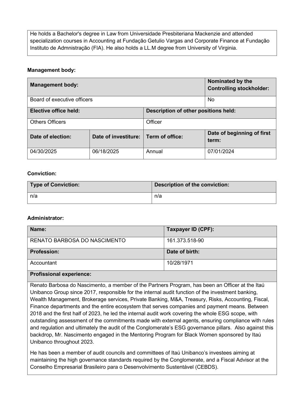 He holds a Bachelor's degree in Law from Universidade Presbiteriana Mackenzie and attended specialization courses in Accounting at Fundação Getulio Vargas and Corporate Finance at Fundação Instituto de Admnistração (FIA). He also holds a LL.M degree from University of Virginia. Management body: Management body: Nominated by the Controlling stockholder: Board of executive officers No Elective office held: Description of other positions held: Others Officers Officer Date of election: Date of investiture: Term of office: Date of beginning of first term: 04/30/2025 06/18/2025 Annual 07/01/2024 Conviction: Type of Conviction: Description of the conviction: n/a n/a Administrator: Name: Taxpayer ID (CPF): RENATO BARBOSA DO NASCIMENTO 161.373.518-90 Profession: Date of birth: Accountant 10/28/1971 Profissional experience: Renato Barbosa do Nascimento, a member of the Partners Program, has been an Officer at the Itaú Unibanco Group since 2017, responsible for the internal audit function of the investment banking, Wealth Management, Brokerage services, Private Banking, M&A, Treasury, Risks, Accounting, Fiscal, Finance departments and the entire ecosystem that serves companies and payment means. Between 2018 and the first half of 2023, he led the internal audit work covering the whole ESG scope, with outstanding assessment of the commitments made with external agents, ensuring compliance with rules and regulation and ultimately the audit of the Conglomerate’s ESG governance pillars. Also against this backdrop, Mr. Nascimento engaged in the Mentoring Program for Black Women sponsored by Itaú Unibanco throughout 2023. He has been a member of audit councils and committees of Itaú Unibanco’s investees aiming at maintaining the high governance standards required by the Conglomerate, and a Fiscal Advisor at the Conselho Empresarial Brasileiro para o Desenvolvimento Sustentável (CEBDS).