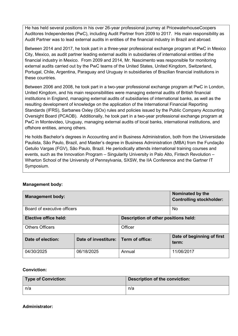 He has held several positions in his over 26-year professional journey at PricewaterhouseCoopers Auditores Independentes (PwC), including Audit Partner from 2009 to 2017. His main responsibility as Audit Partner was to lead external audits in entities of the financial industry in Brazil and abroad. Between 2014 and 2017, he took part in a three-year professional exchange program at PwC in Mexico City, Mexico, as audit partner leading external audits in subsidiaries of international entities of the financial industry in Mexico. From 2009 and 2014, Mr. Nascimento was responsible for monitoring external audits carried out by the PwC teams of the United States, United Kingdom, Switzerland, Portugal, Chile, Argentina, Paraguay and Uruguay in subsidiaries of Brazilian financial institutions in these countries. Between 2006 and 2008, he took part in a two-year professional exchange program at PwC in London, United Kingdom, and his main responsibilities were managing external audits of British financial institutions in England, managing external audits of subsidiaries of international banks, as well as the resulting development of knowledge on the application of the International Financial Reporting Standards (IFRS), Sarbanes Oxley (SOx) rules and policies issued by the Public Company Accounting Oversight Board (PCAOB). Additionally, he took part in a two-year professional exchange program at PwC in Montevideo, Uruguay, managing external audits of local banks, international institutions, and offshore entities, among others. He holds Bachelor’s degrees in Accounting and in Business Administration, both from the Universidade Paulista, São Paulo, Brazil, and Master’s degree in Business Administration (MBA) from the Fundação Getulio Vargas (FGV), São Paulo, Brazil. He periodically attends international training courses and events, such as the Innovation Program – Singularity University in Palo Alto, Fintech Revolution – Wharton School of the University of Pennsylvania, SXSW, the IIA Conference and the Gartner IT Symposium. Management body: Management body: Nominated by the Controlling stockholder: Board of executive officers No Elective office held: Description of other positions held: Others Officers Officer Date of election: Date of investiture: Term of office: Date of beginning of first term: 04/30/2025 06/18/2025 Annual 11/06/2017 Conviction: Type of Conviction: Description of the conviction: n/a n/a Administrator: